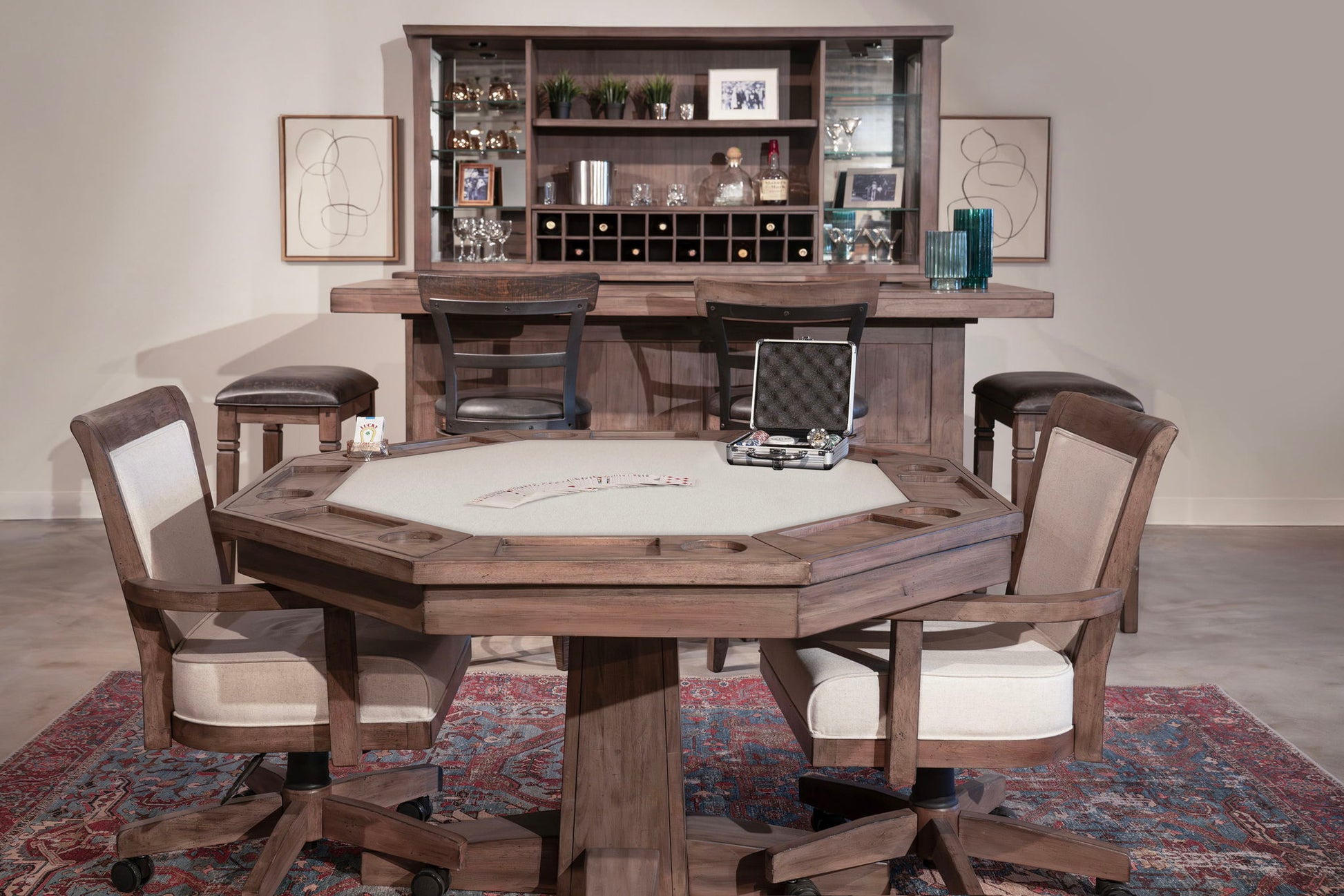 - 2-in-1 reversible table design: dining surface and poker game top