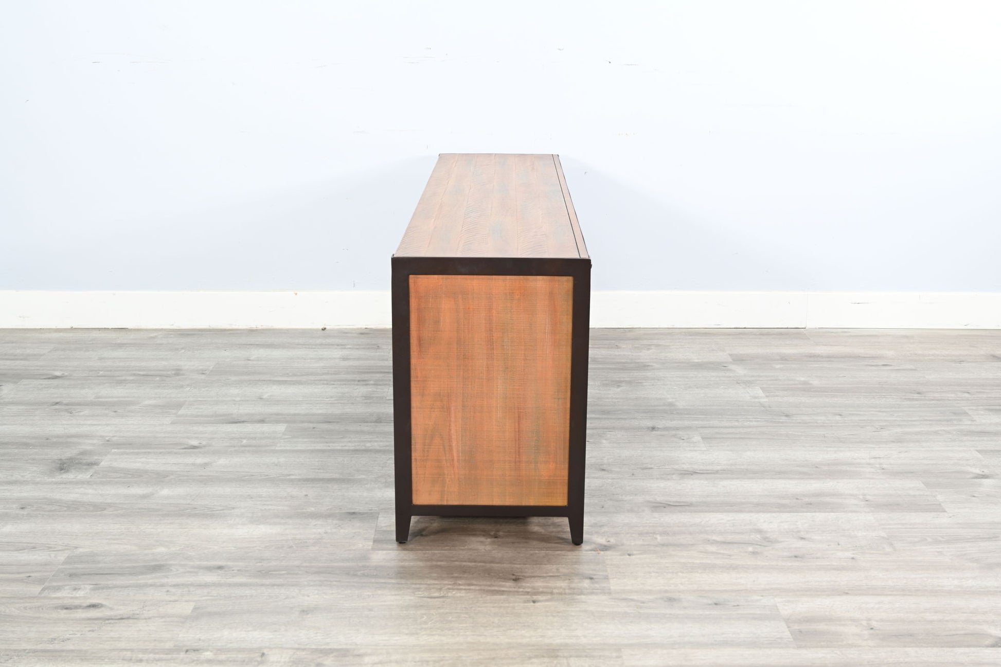 The San Diego media console is a masterful fusion of craftsmanship and style, designed to be the centerpiece of any living space. Constructed from solid mahogany and rich veneers, it showcases hand-brushed, powder-coated metal accents and a saw-cut console top, adding a touch of industrial charm. Finished in a warm antique brown, this elegant piece offers both timeless beauty and functionality with a built-in electric fireplace heater, capable of warming areas up to 1,000 square feet, making it as practical as it is sophisticated.