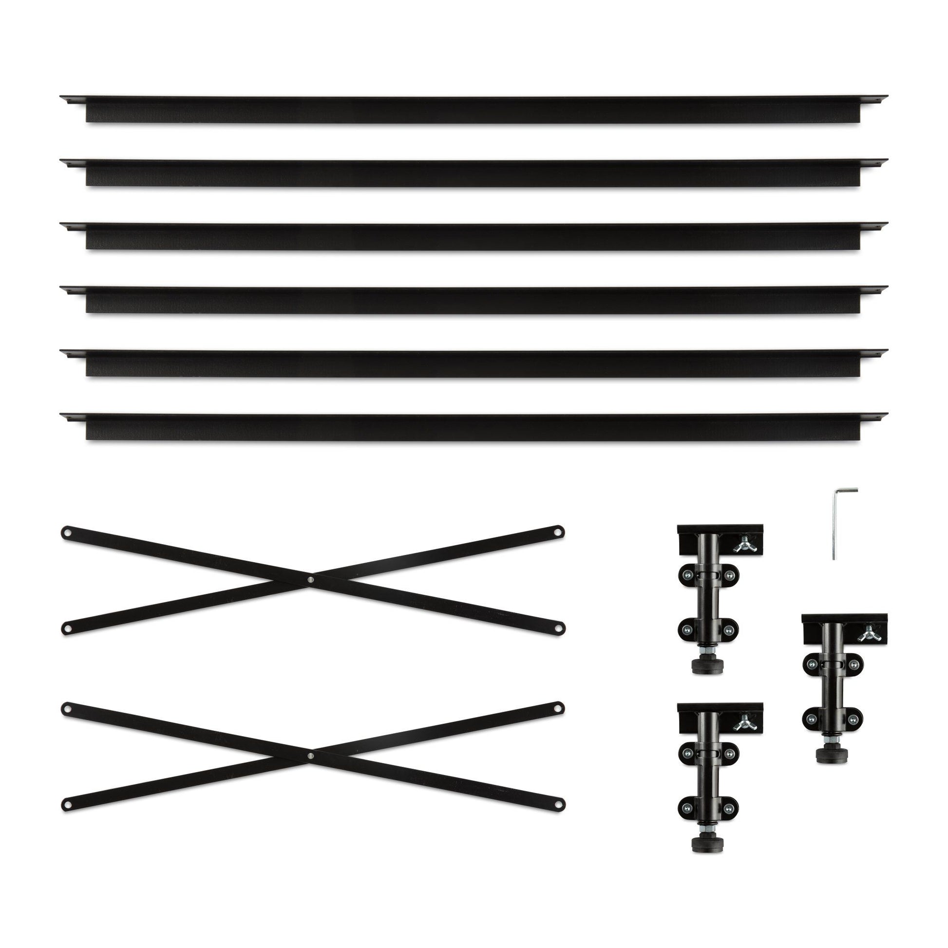 Upgrade a wooden bed frame with the stable support of steel crossrails and a heavy-duty center support. Much stronger than wooden slats, the Adjustable Center Support System adjusts to fit Full, Full XL, Queen, King and California King bed sizes. Three cross rails adjust from 42 to 84 inches wide and lock by tightening an attached clamp. Rails have pre-drilled holes for frame attachment. The center support length can be adjusted for customized support, and three legs on the center support adjust in height. Use the included allen wrench to adjust leg height from 6.5 to 15.5 inches.