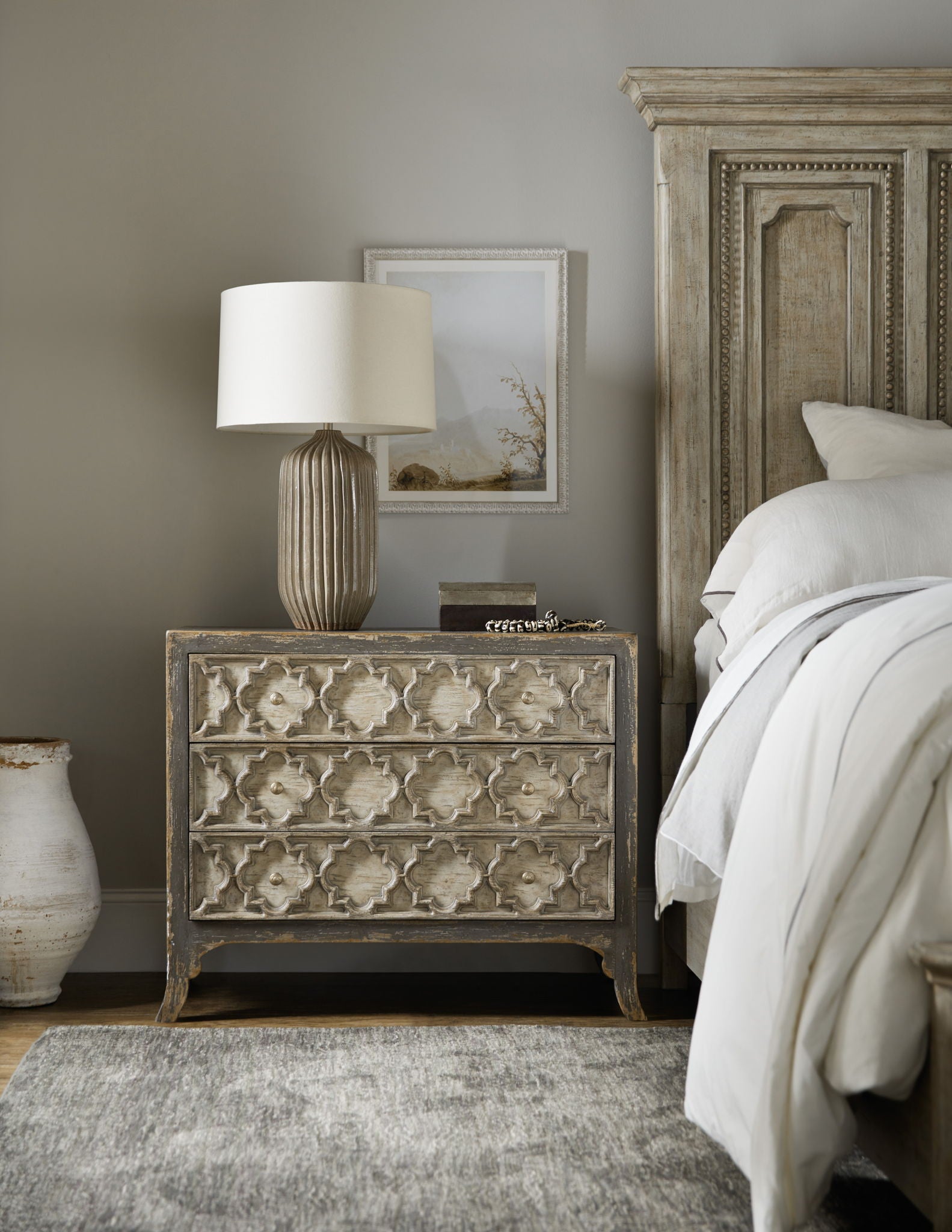 In a European provincial silhouette with a Moroccan flair, the Bellissimo Bachelors Chest is adorned with geometric motifs on the front, and a two-tone finish treatment. Pottery, or dark gray, is on the outside of the case, and Light Tusk, or light taupe, is on the drawer fronts. A touch of elegance is added with hand-hammered Florentine gold knob hardware. The three drawers have self-closing undermount drawer guides. In the top drawer is a drop-in felt liner and the bottom drawer is cedar lined. Three-plug electrical outlet.