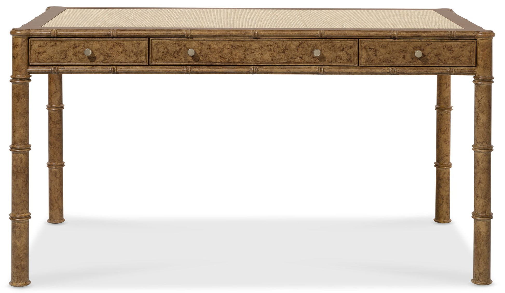 The Archives Writing Desk combines historical charm with modern functionality, ideal for creating a sophisticated home office. Its design features rich birch and oak veneers, a unique mottled amber faux-tortoise shell accent finish, and woven cane top with a protective glass insert. Perfect for both writing and work, this desk offers three drawers, a drop-front center drawer for a keyboard, and removable dividers for organization. The satin brass custom knob hardware adds a luxurious touch, making it the perfect blend of style and practicality.