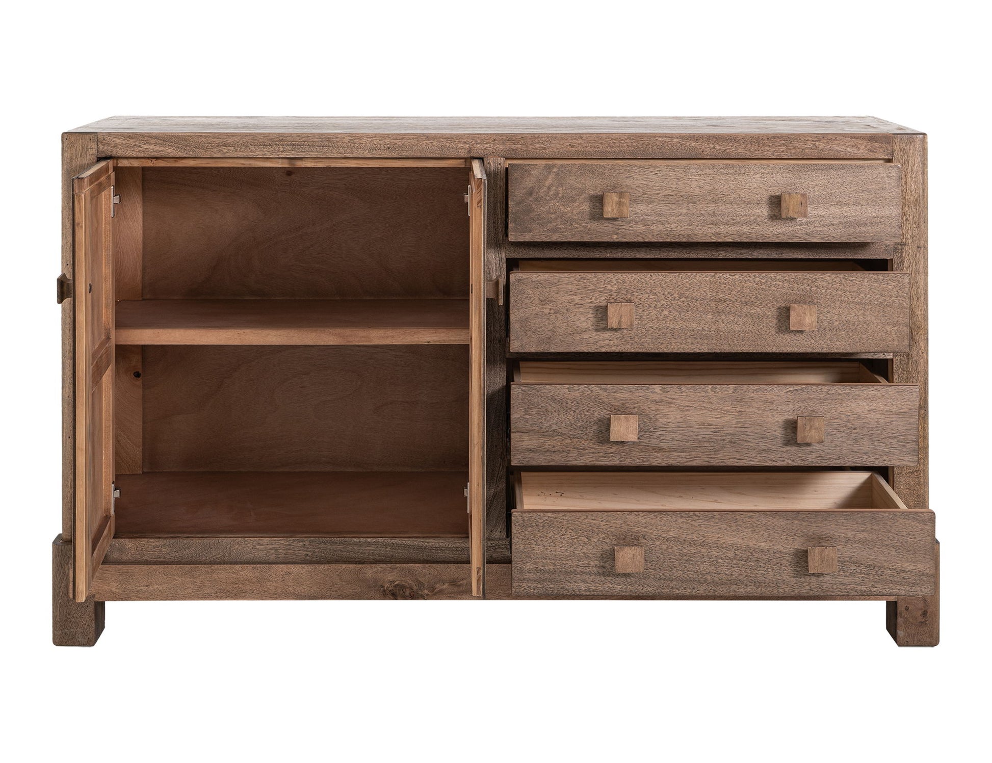 4 Drawer & 2 Doors, Console. Bring the beauty of nature indoors with the Atenas Console. This piece seamlessly combines style and functionality. Crafted from sustainable mango wood and engineered melina wood, it features a multi-step lacquer finish that provides a smooth and polished appearance, making it not only aesthetically pleasing but also easy to maintain. The natural brown finish highlights the unique grain patterns of the wood, ensuring that each console is one of a kind. The slatted doors and side panels are made from engineered melina wood, adding visual texture while providing structural stability. Additionally, it features four spacious drawers made of solid wood. The simple wood-squared pulls on the drawers blend seamlessly with the overall modern rustic design. Standing on sturdy legs, this console offers stability and a touch of rustic charm, ideal for enhancing any bedroom decor.