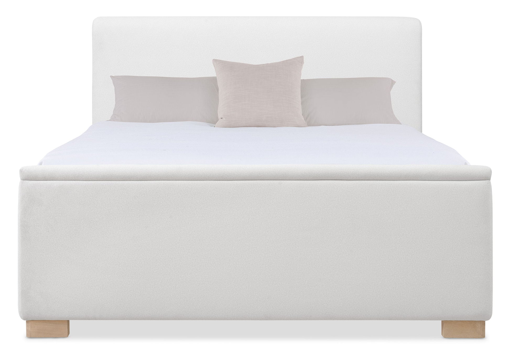 Elevate your bedroom with the Banyon Bay Upholstered Bed. Featuring a fully upholstered, padded design and wood block feet, this bed combines clean, contemporary lines with natural textures, making it a perfect fit for modern, casual lifestyles. Crafted from oak solids and oak veneers, the finish is enhanced by wire-brushing and cerusing for added texture. The headboard, footboard, and rails come together to create a cohesive, stylish look that complements any interior design.