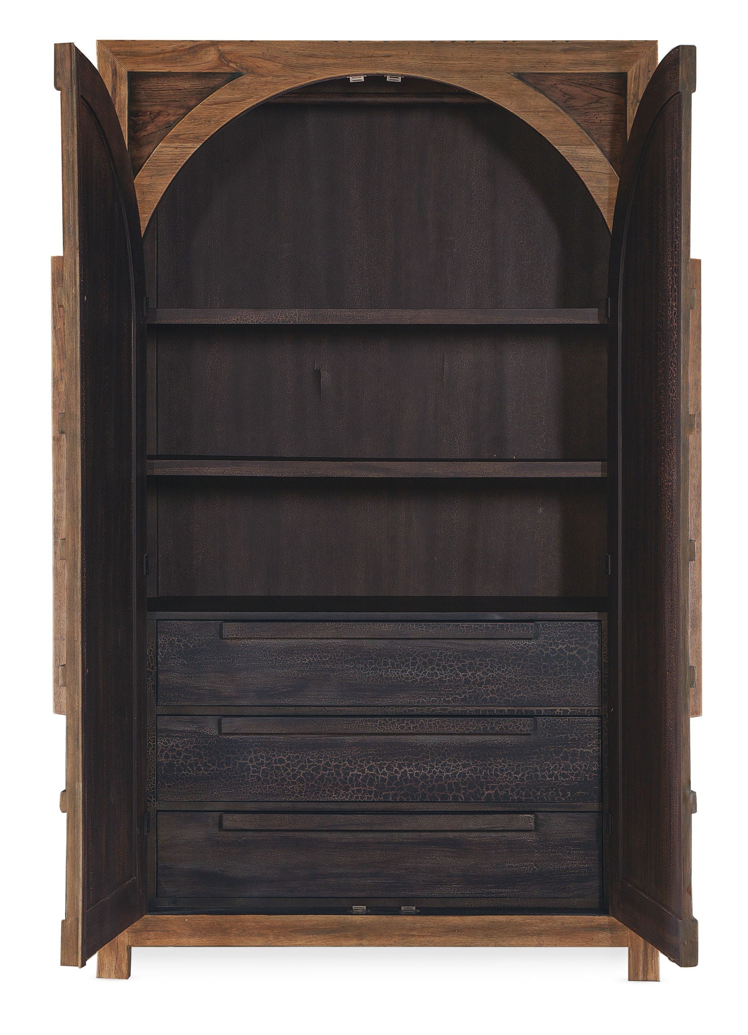 Inspired by the grandeur of wide open spaces in the American wilderness, the Big Sky Wardrobe exudes warmth with its rustic Pecky Hickory Veneers and Vintage Natural finish. The sweeping arched panel at the top of the case, authentic door hinges and wood bar hardware take you back to the heritage of post and beam construction and true craftsmanship. Behind the two doors is a removable clothes rod, two adjustable shelves and three drawers.