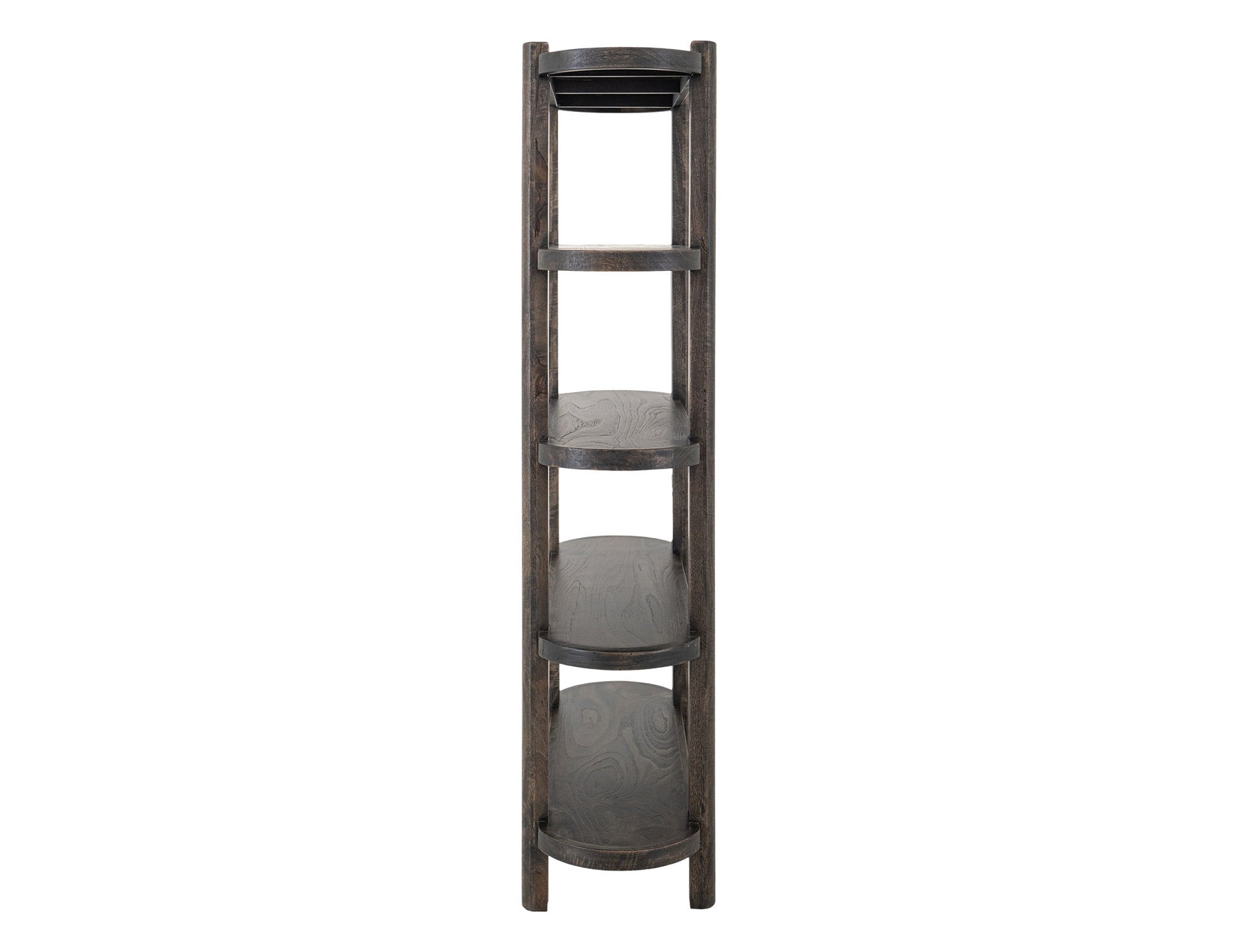 4 Shelves, Bookcase. Our exquisite Black Balam collection is meticulously handcrafted using high-quality mango and teak wood. This simple yet striking collection is designed to infuse your space with an organic, modern aesthetic. The bookcase boasts a unique organic shape, featuring elegantly curved oval shelves and rounded legs, adding a touch of sophistication to any room.