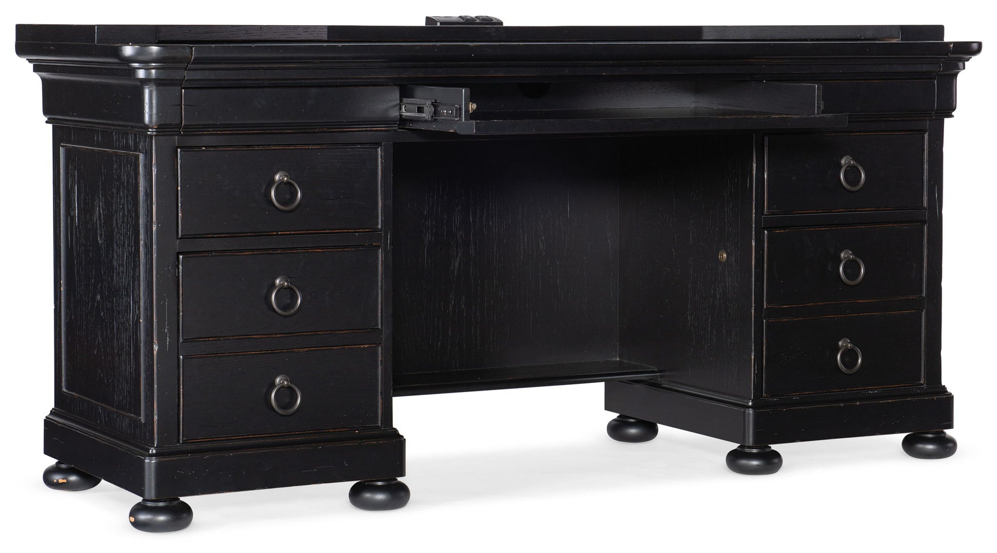Casual yet refined and stylish, the Bristowe Computer Credenza sets a professional and inviting tone for any work-from-home space. Crafted of Pecan Veneers in a Tuxedo black paint finish with touches of warm brown and accentuated by 4 bun feet on each side of the desk, there are 7 drawers including the top left and right drawers with full extension metal ball bearing slides with removable divider inserts. The top drawers have finger grooves to open and the bottom drawers are locking file drawers with pendaflex filing system and full extension metal ball bearing slides. There is a power supply on top. The desk top area above the center drawer pulls out for added work surface.