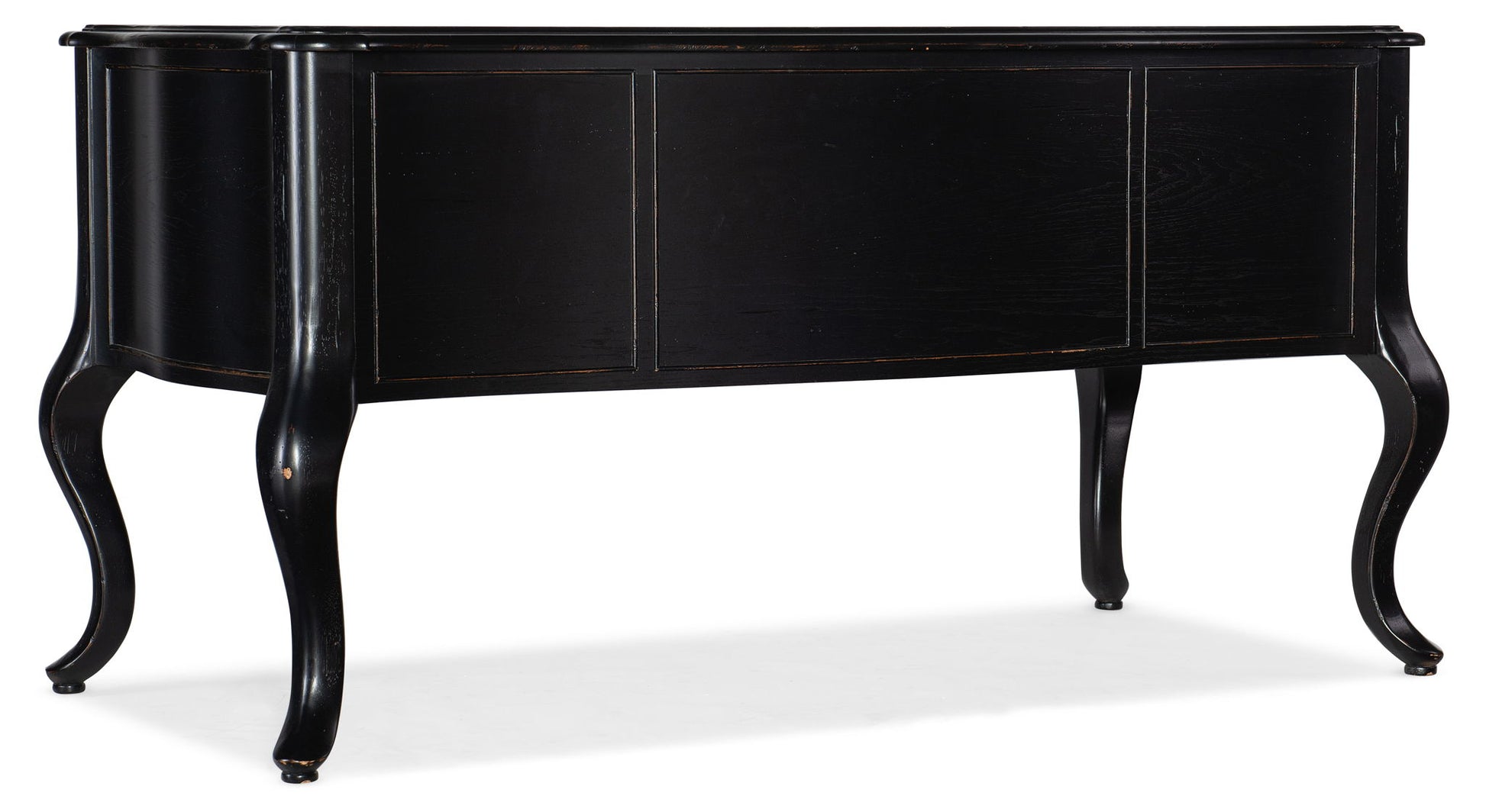 Casual yet refined and stylish, the Bristowe Executive Desk sets a professional and inviting tone for any work-from-home space. The dramatic desk silhouette is crafted of Pecan Veneers in a Tuxedo black paint finish with touches of warm brown, and is accentuated by oil-rubbed bronze-finished rings and pull hardware and boldly-shaped cabriole legs. The desk offers 4 drawers, with the left drawer a file drawer with pendaflex system and full extension metal ball bearing slides and the top right drawer featuring a removable pencil tray, inserts and removable writing slide with full extension metal ball bearing slides. The center drawer has a drop-front for keyboard use and a wire cutout in the back of the drawer. The right bottom drawer has a false bottom with finger hold for hidden storage and is on full extension metal ball bearing slides. The desk is finished on all sides so it can float in a room.