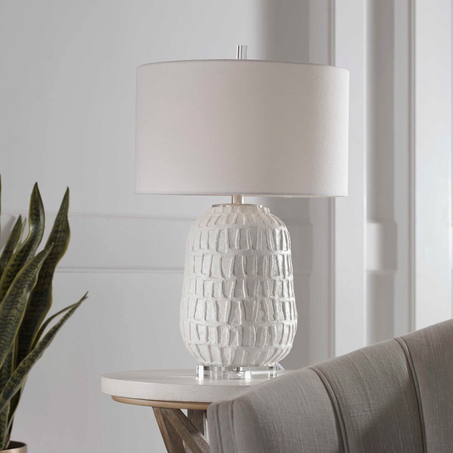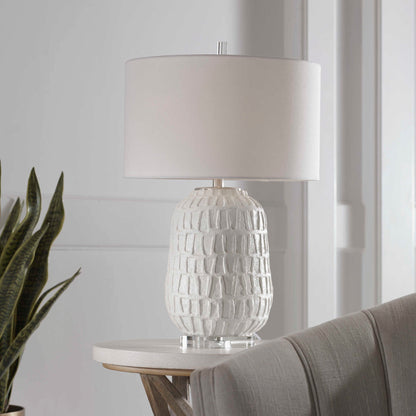 A Modern Take On Old World Style, This Table Lamp Features A Textured, Aged White Ceramic Base With An Organic Grid Design Displayed On A Thick Crystal Foot With Polished Nickel Accents. The Lamp Is Paired With A White Linen Drum Shade.