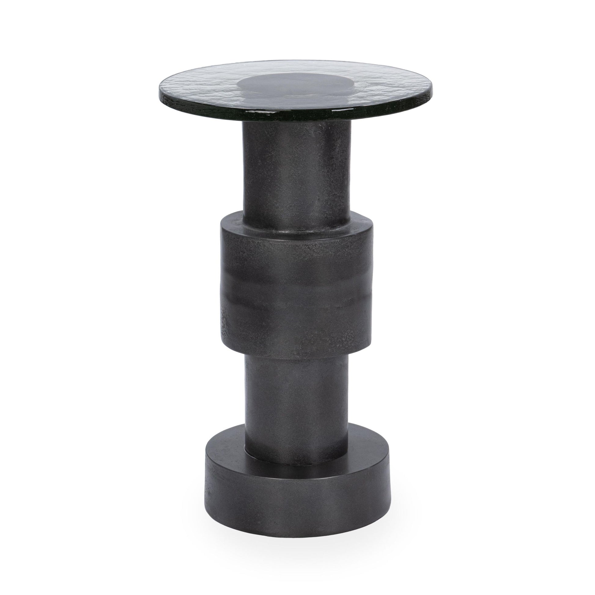 Eye-catching and sculptural, this modern accent table showcases a tiered geometric cast aluminum base topped with sleek cast glass. Blending industrial style with versatile function, it’s perfect as a side table, end table, or striking statement piece. Ideal for contemporary living rooms or bedrooms, this table adds a sophisticated edge and a touch of artistic flair to any space. Elevate your decor with this distinctive and practical design.