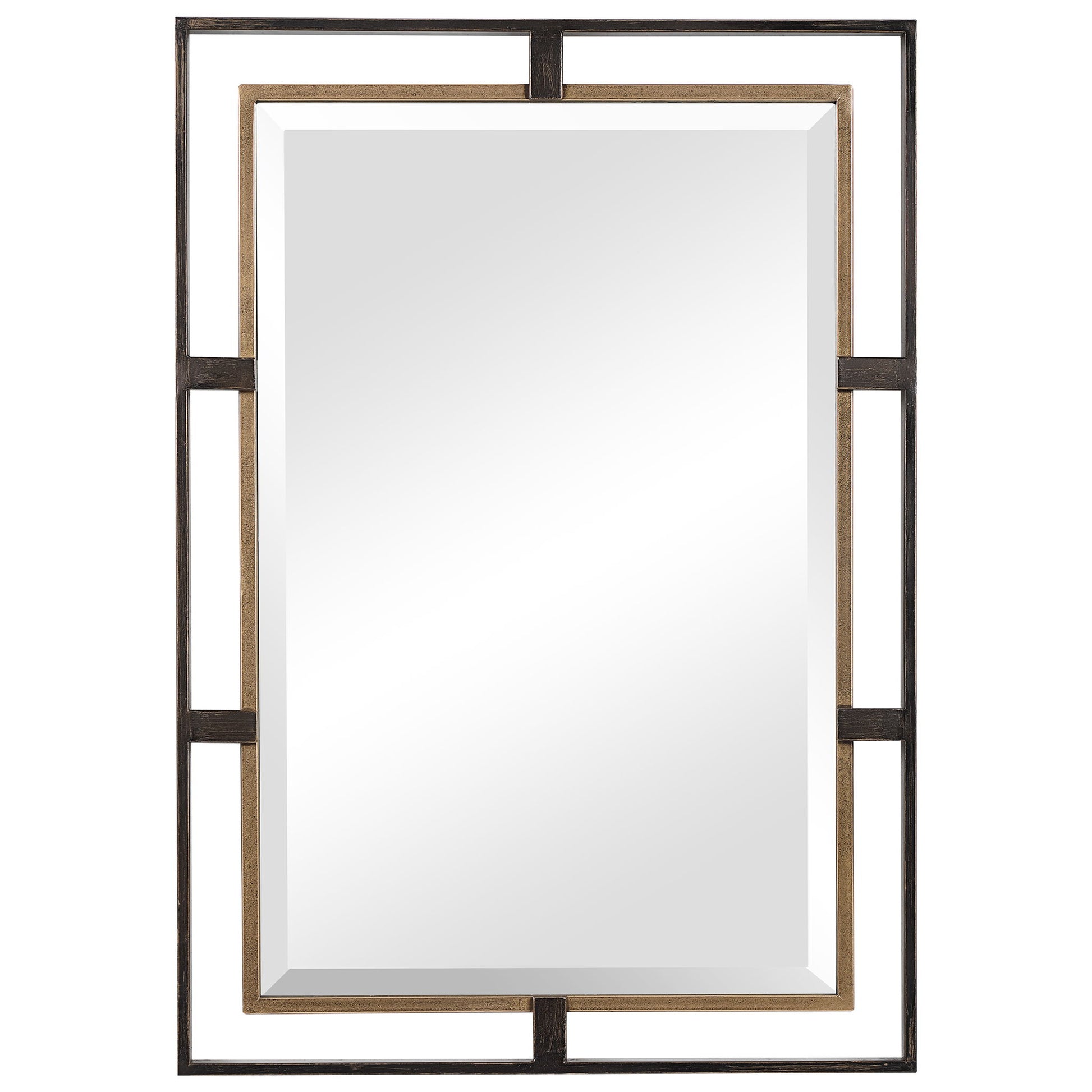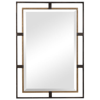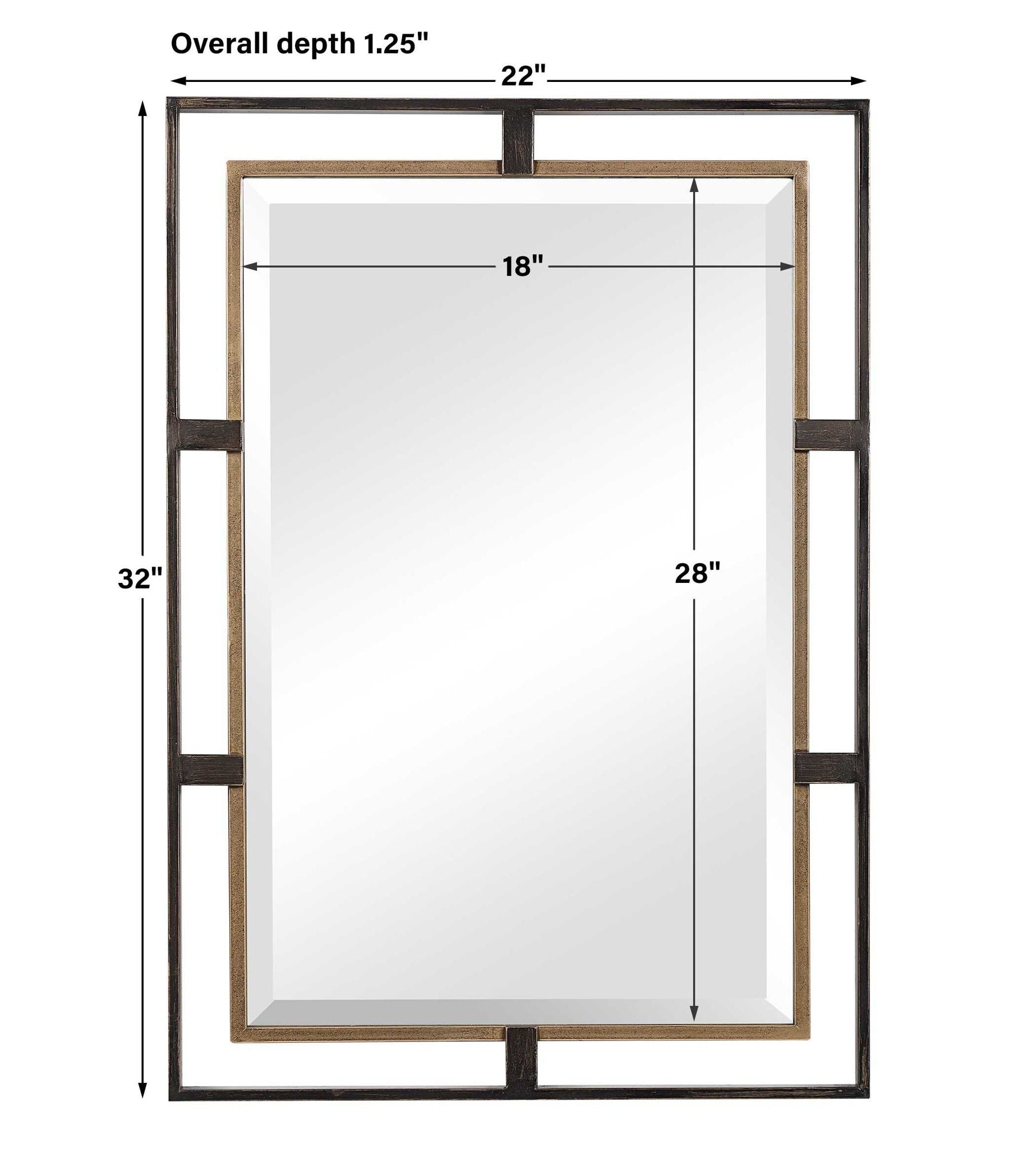 This Iron Frame Features A 3-dimensional Design With An Outer Overlapping Frame Finished In A Distressed Rustic Bronze, Accented With A Lightly Antiqued Gold Center. This Mirror Is Complemented By A 1" Bevel And May Be Hung Horizontal Or Vertical.