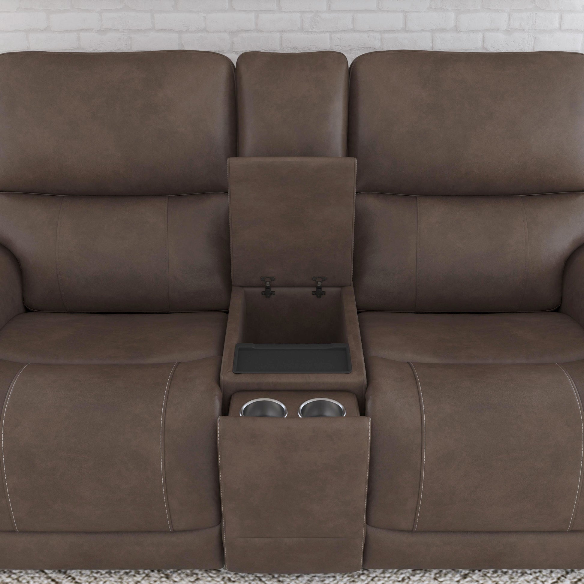 Power up and enjoy secretive perks with the Carter power reclining loveseat with console. Customize your comfort with adjustable recline, headrest and lumbar support on both seats, including reclining to a Zero Gravity position for a weightless experience, reducing pressure on joints. This loveseat will be a statement in your home with its genuine leather look that is a durable, easy to clean fabric in a cappuccino brown color, and Flexsteel's patented Blue Steel Spring™ at the heart of each seat for ultimate durability. Flared arms, a contoured seats and heavy thread stitching details give it a sleek, yet striking look. And it all comes with discreet storage perks, including pop-out cupholders in the arms and a center storage console and a wireless charging pad.