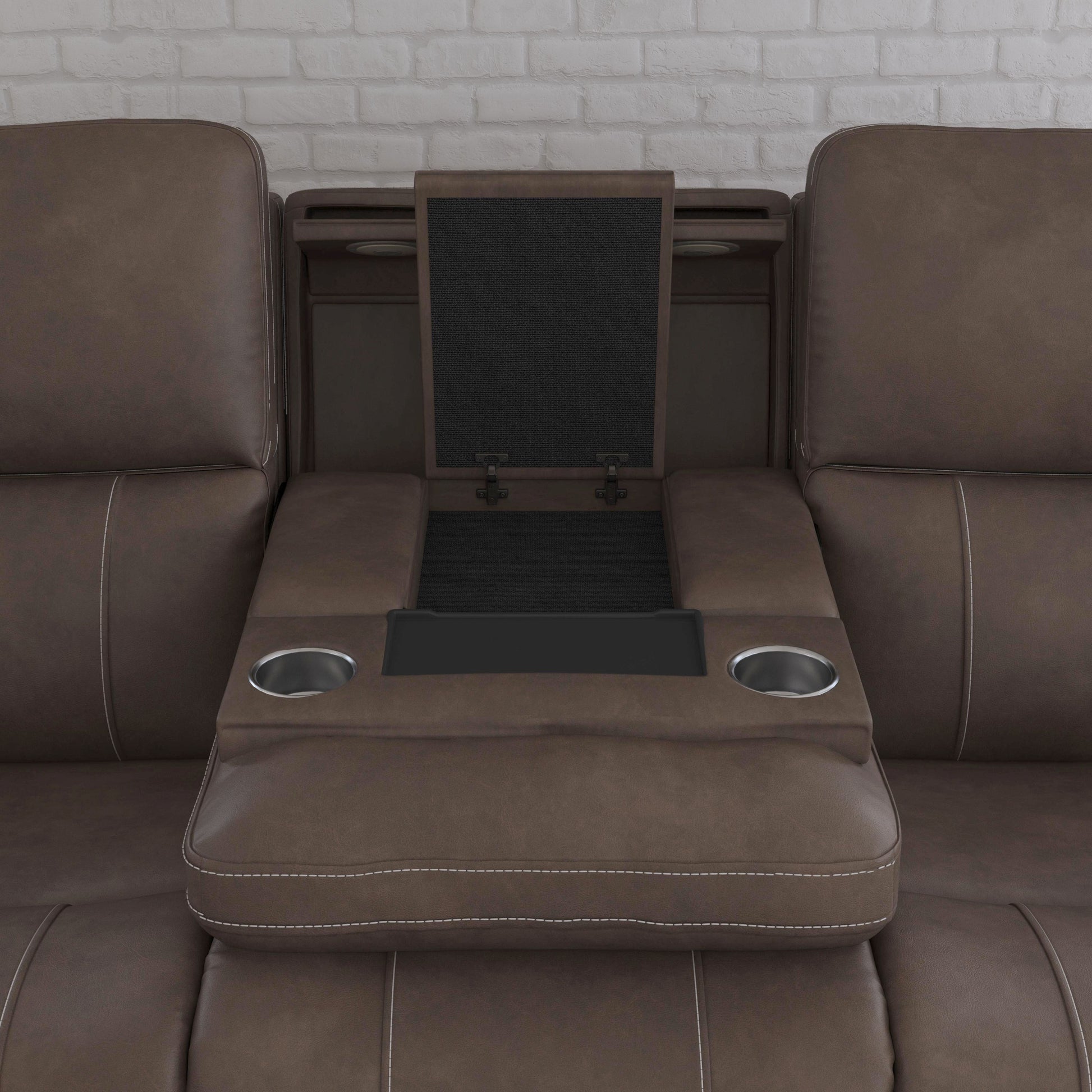 Power up and enjoy secretive perks with the Carter power reclining sofa. Customize your comfort with adjustable recline, headrest and lumbar support on each end seat, including reclining to a Zero Gravity position for a weightless experience, reducing pressure on joints. This sofa will be a statement in your home with its genuine leather look that is a durable, easy to clean fabric in a cappuccino brown color, and Flexsteel's patented Blue Steel Spring™ at the heart of each seat for ultimate durability. Flared arms, a contoured seats and heavy thread stitching details give it a sleek, yet striking look. And it all comes with discreet storage perks, including pop-out cupholders in the arms and a flip-down center cushion that reveals a storage console, touch lighting and a wireless charging pad.