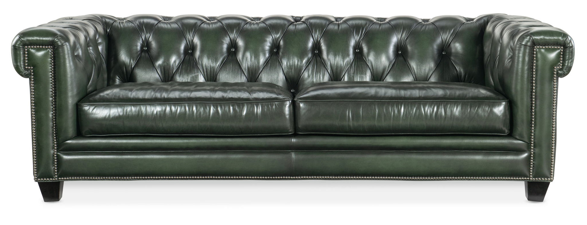 Grand in style and timeless in appeal, the Charleston Tufted Sofa is a showstopper with a plush button-tufted back and arms in the classic Chesterfield style. Featuring two upholstered seats and pewter nailhead trim, the Charleston has wood feet with a black finish and is upholstered in the Sarzana Portal finished, wipe-off top grain leather.