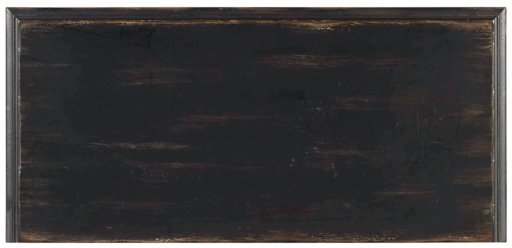 With a vintage charm, the black hand-painted leg chest with rub-though is nostalgic and timeless with turned legs and a stretcher, a shaped base and ring pulls on decorative back plates. Two doors with one adjustable shelf.