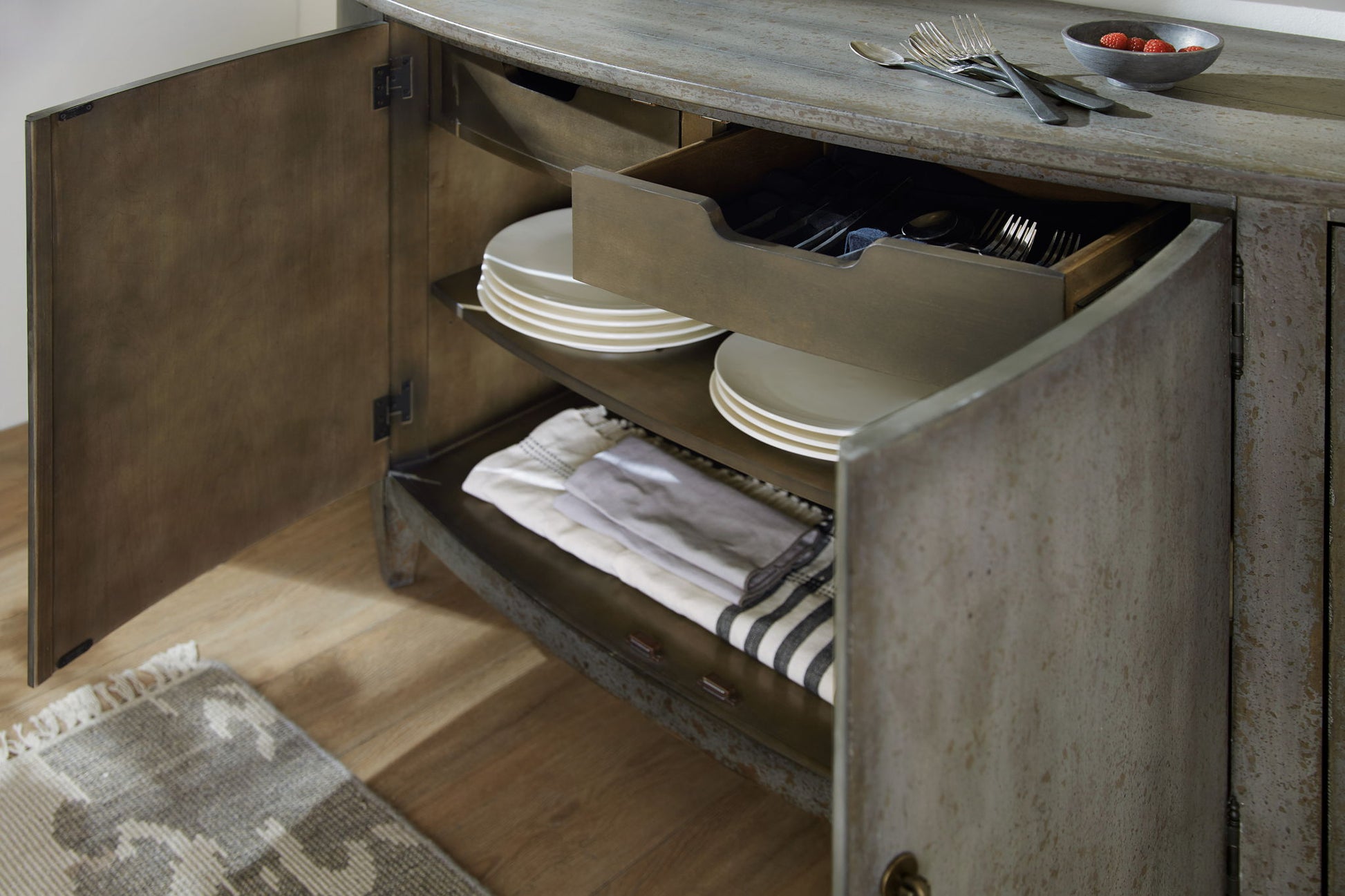 Inspired by European farmhouses, the graceful silhouette of the Ciao Bella Buffet will give a designer flair to any room. As a delightful bonus, this piece is packed with storage, with one adjustable shelf behind each pair of center doors, 2 fixed shelves behind the left and right doors, 2 drawers behind the center doors and drop-in felt liners with silverware storage. Crafted of Poplar and Hardwood Solids with Maple Veneers, the buffet features a character-filled Speckled Gray finish with hand chiseling and multi-layer rub-through. Tear-drop hardware adds a sparkle of style.