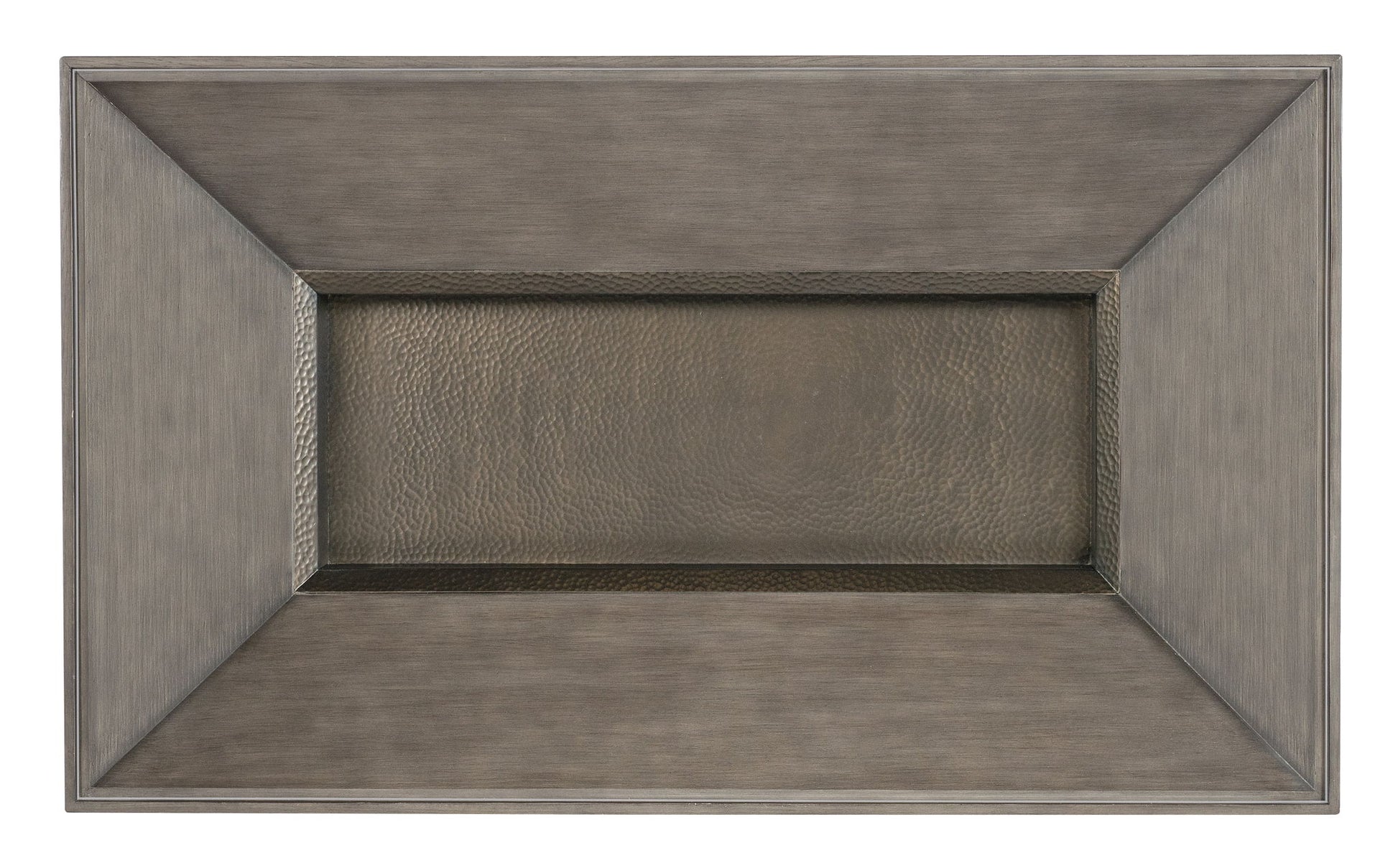 An intriguing mixture of shape, materials and color, the rectangle-shaped Travelers Cocktail Table has a concave design under glass with hammered metal inset. It combines Oak Veneers, hand-forged sheet metal and a tempered glass top and features a dark wood finish.