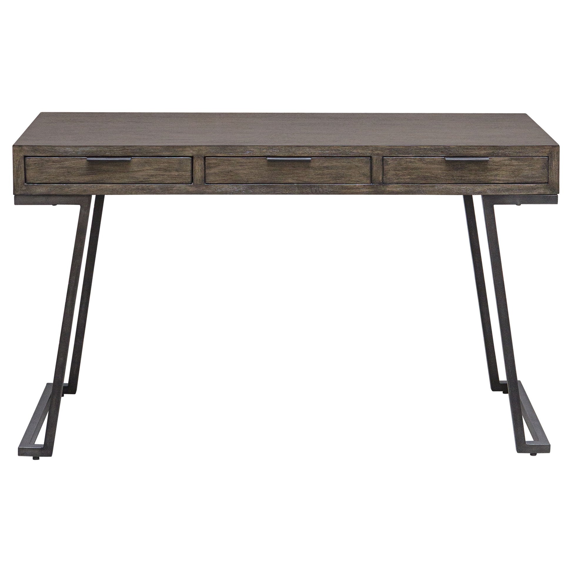 The Comrade Desk Provides A Perfect Spot For Ample Productivity. The Desk Is Finished In A Mango Wood Veneer With Light Gray Glazing And Natural Wood Undertones, Supported By A Metal Base In Aged Steel. Features Three Drawers With Coordinating Metal Tab Drawer Pulls.