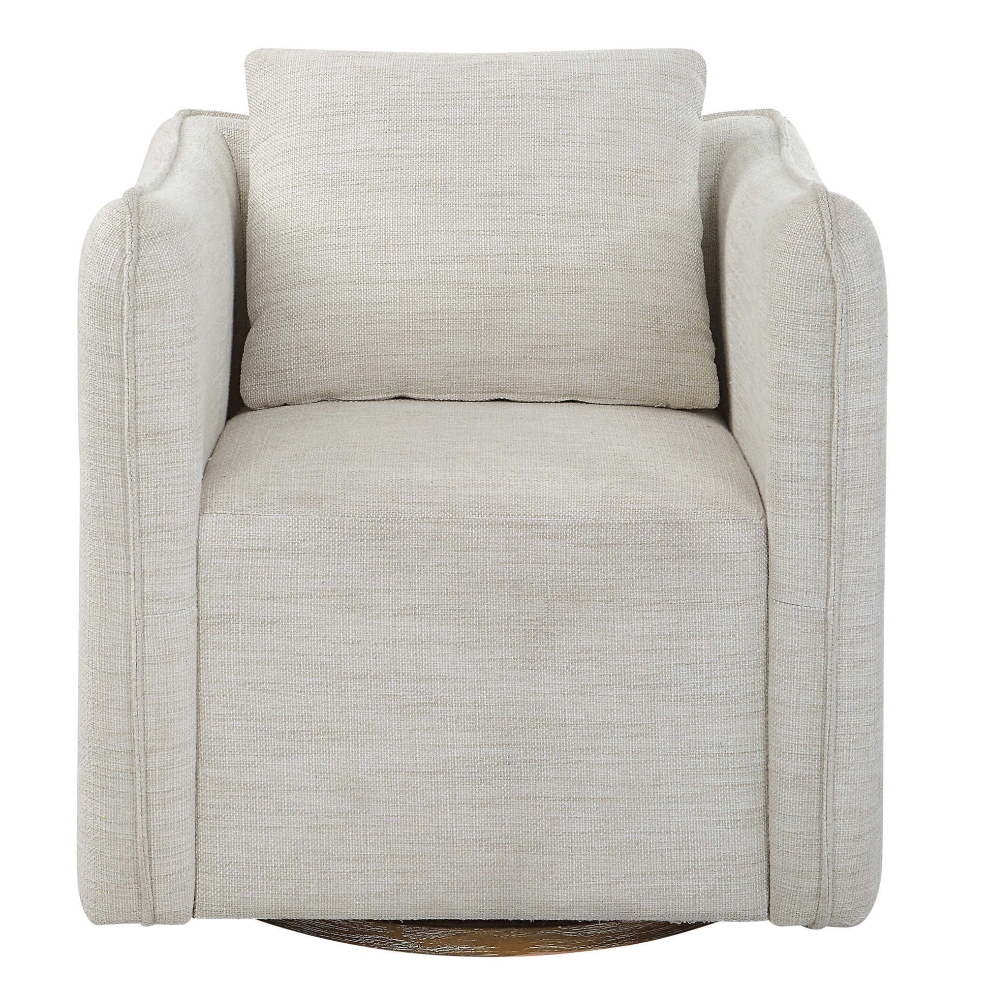 Casual Shelter Arm Accent Chair Tailored In A Woven Linen Blend Fabric In Off-white, Featuring A Flanged Edge Trim Complete With A Loose Back Pillow. Rests On A Solid Birch Wood Swivel Base, Finished In A Weathered Gray Stain.