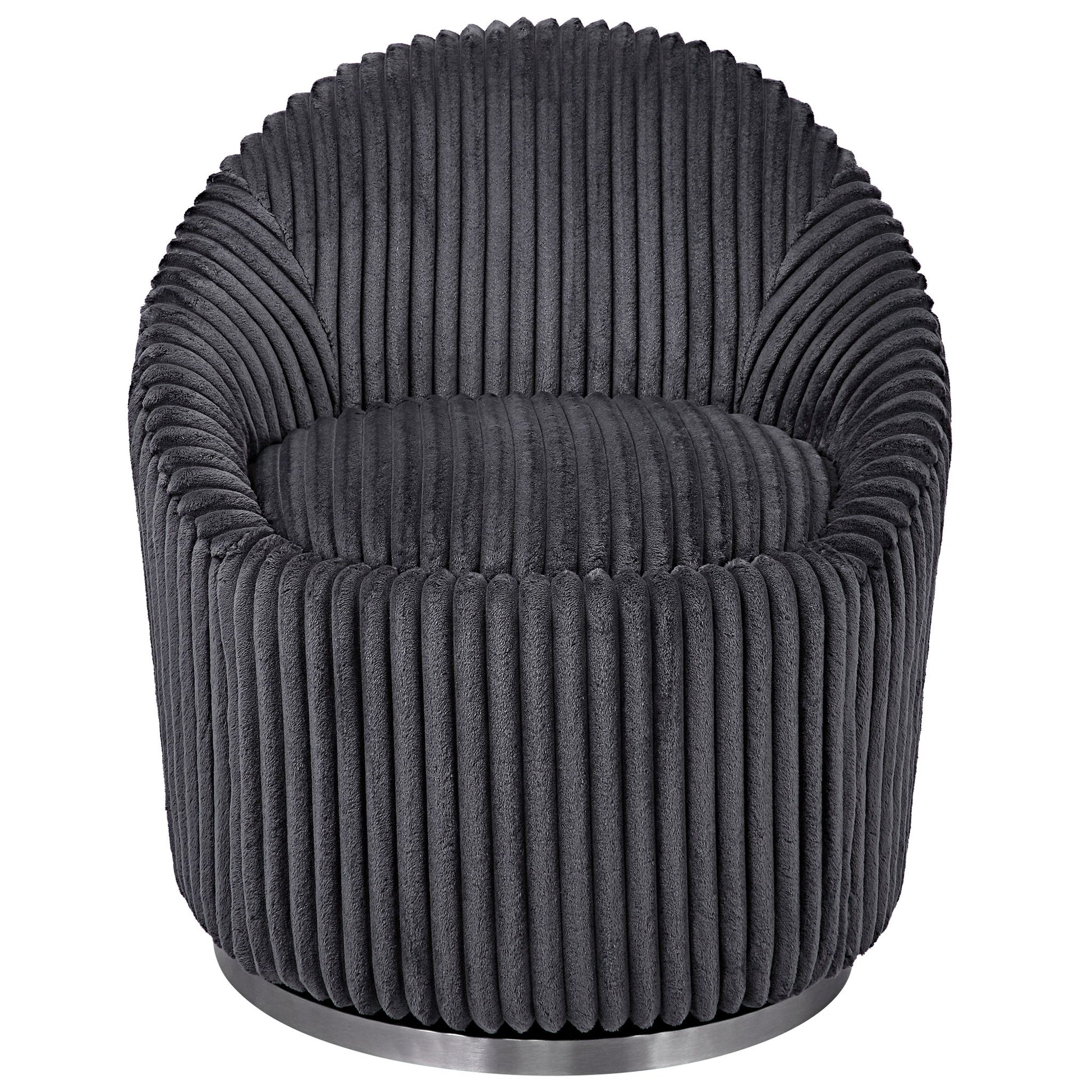 A Contemporary Accent With A Modern Edge, This Chair Is Upholstered In A Luxurious Fluted Gunmetal Chenille Fabric And Is Accented By A Stainless Steel Swivel Base Finished In Brushed Nickel.