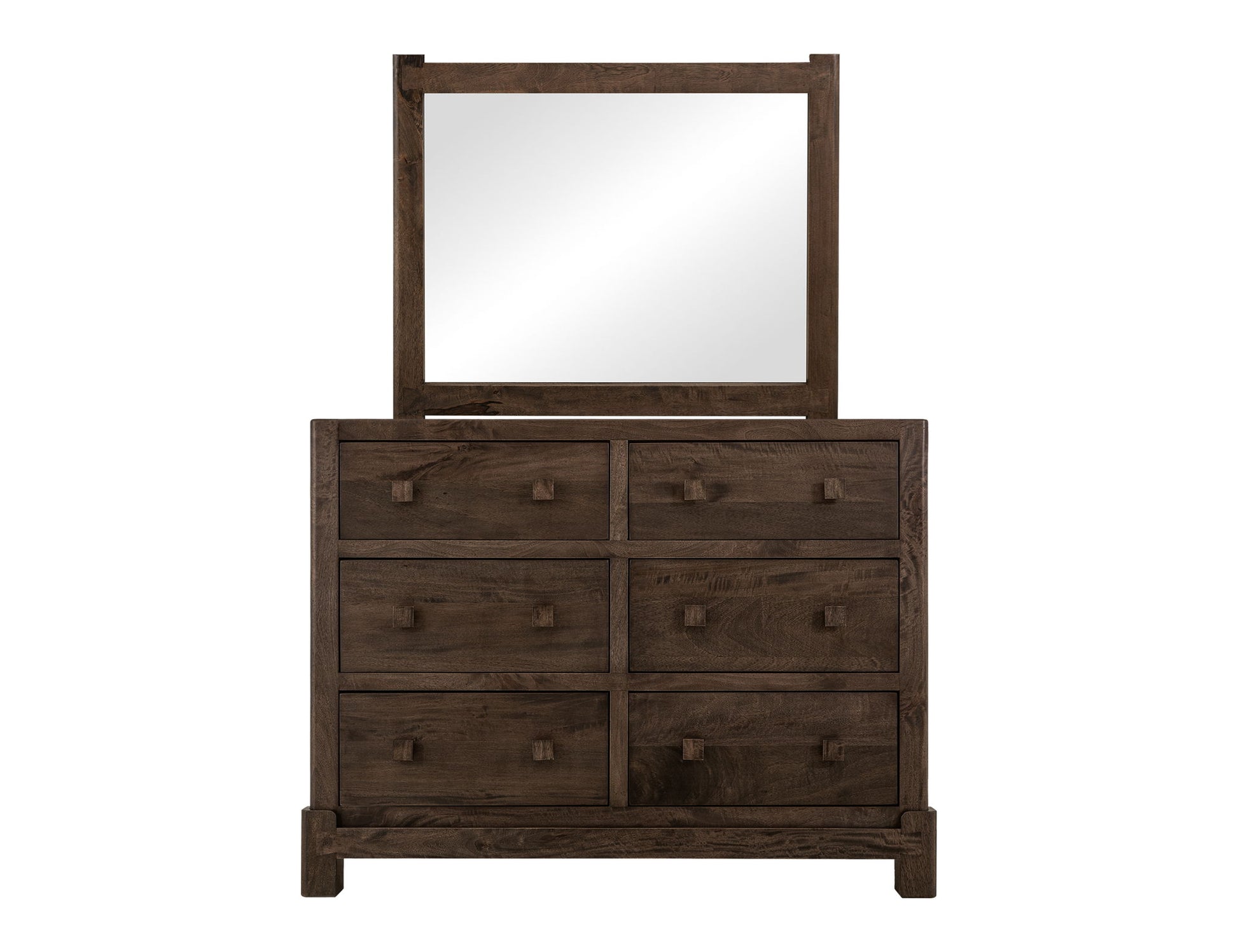 6 Drawer, Dresser. Bring the beauty of nature indoors with the Dark Atenas Bedroom Set. Experience the harmony of style and functionality. Made from Mango and Melina wood, it features a multi-step lacquer finish that provides a smooth and polished appearance, making it not only aesthetic but also easy to maintain. The natural brown finish accentuates the wood's unique grain patterns, guaranteeing that each item is unique. The Dark Atenas Dresser features six drawers for ample storage. The simple wood-squared pulls on the drawers blend seamlessly with the overall modern rustic design. Standing on sturdy legs, this dresser provides stability and a touch of rustic charm, perfect for elevating any bedroom decor.