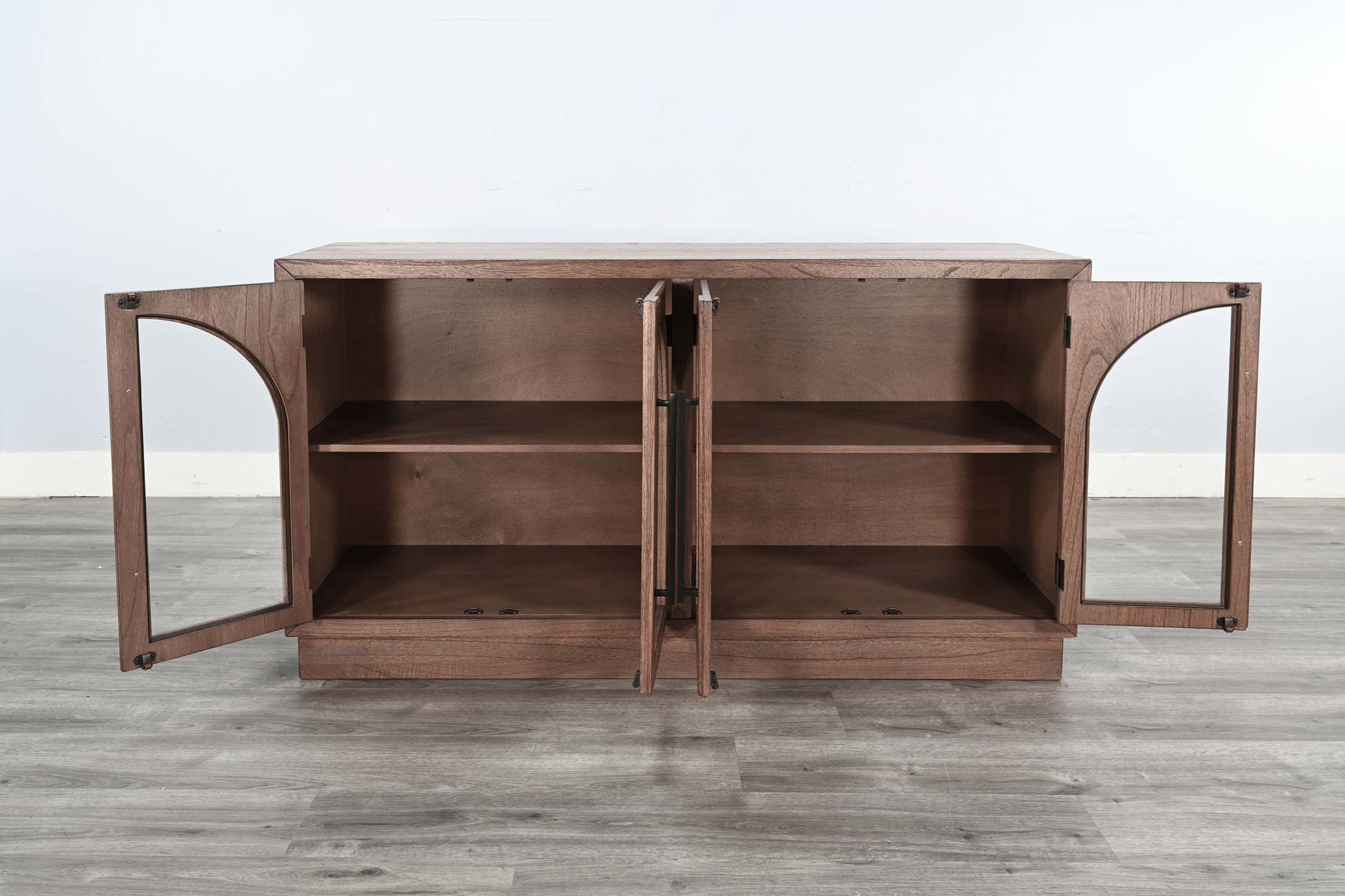 Add timeless character and functional beauty to your space with this 4-door display cabinet. Featuring arched glass-panel doors framed in warm wood tones, this piece brings a refined yet approachable look that complements both modern farmhouse and transitional interiors. The black metal handles add a touch of contrast and industrial flair, while the adjustable interior shelves offer flexible storage for everything from dinnerware to décor. Whether used in a dining room, hallway, or living area, this cabinet blends style and purpose effortlessly.