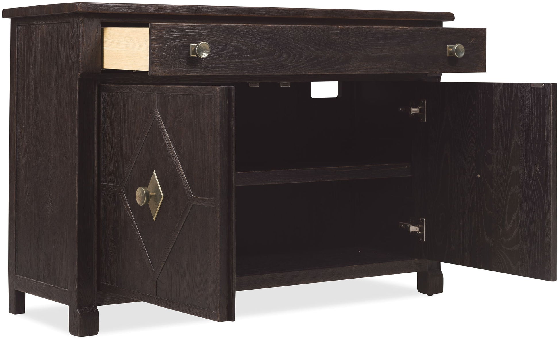 The finish lends a bold, contemporary edge to this hall chest. With its self-closing drawer, diamond-patterned doors, and fixed shelf, it merges functional storage with striking design.
