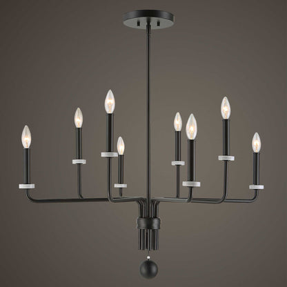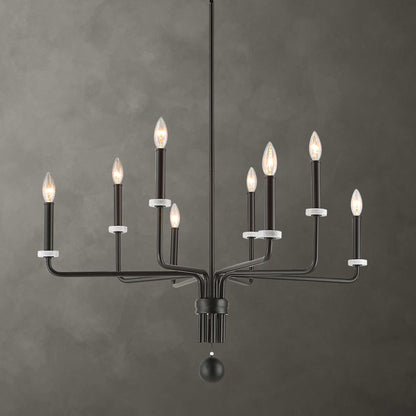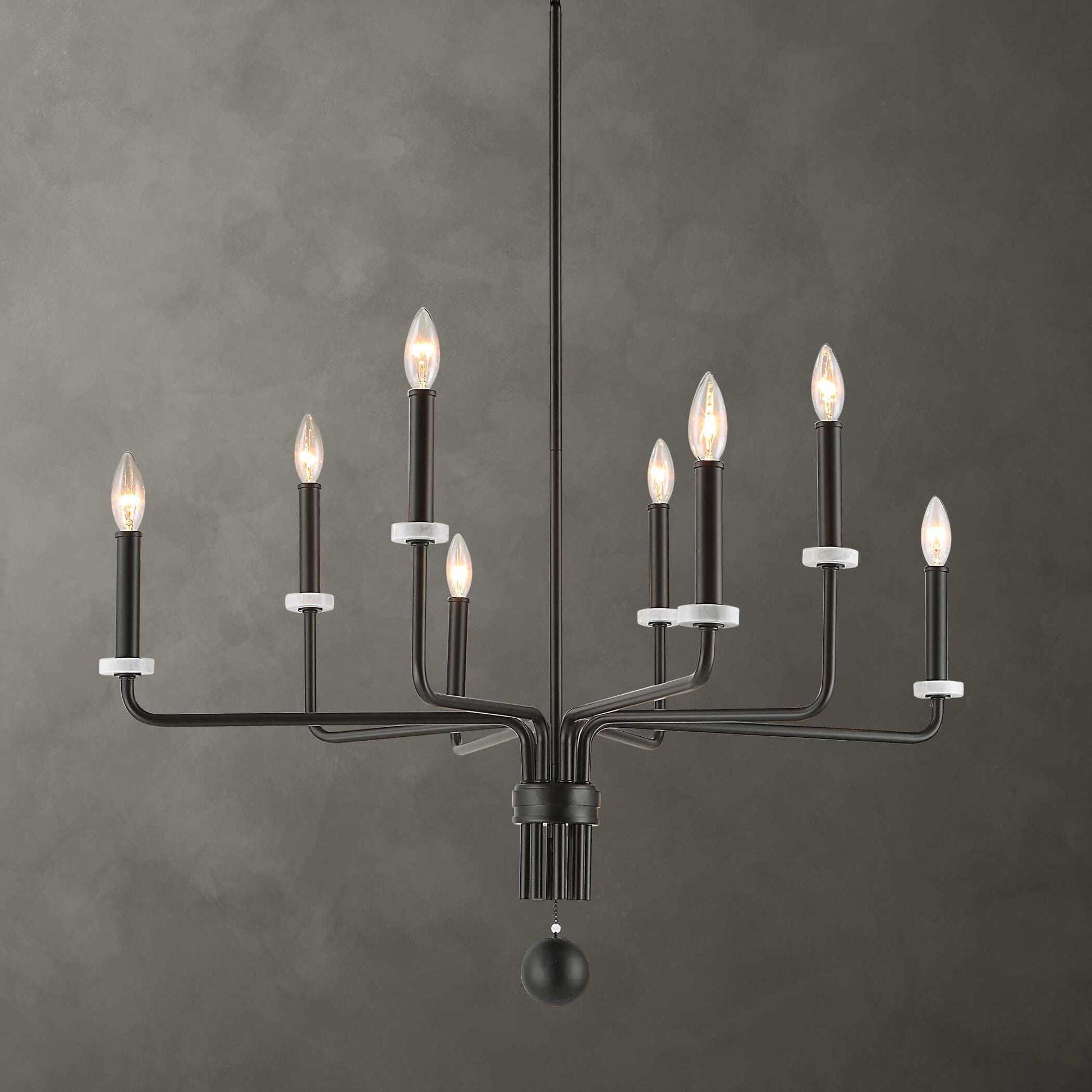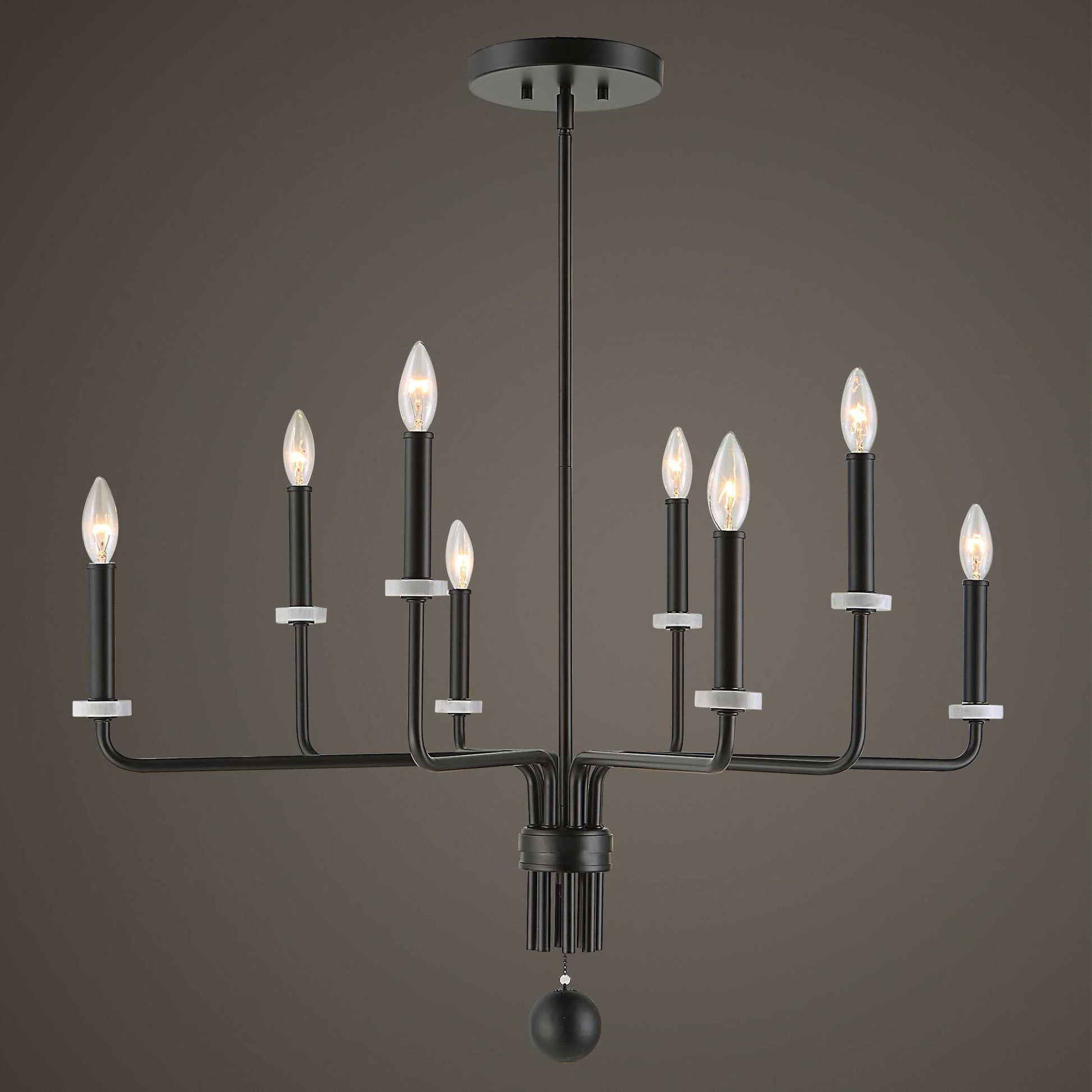 Modern & Sleek Softly Bent Lines Give This 8 Lt. Chandelier A Dramatic Feel, Finished In A Deep Matte Black With Chic White Marble Disc Bobeches. 8-60 Watt Max, Candelabra Sockets. Bulbs Not Included. Supplied With 15' Wire, And 3-12" Stems & 1-6" Stem For Adjustable Installation.
