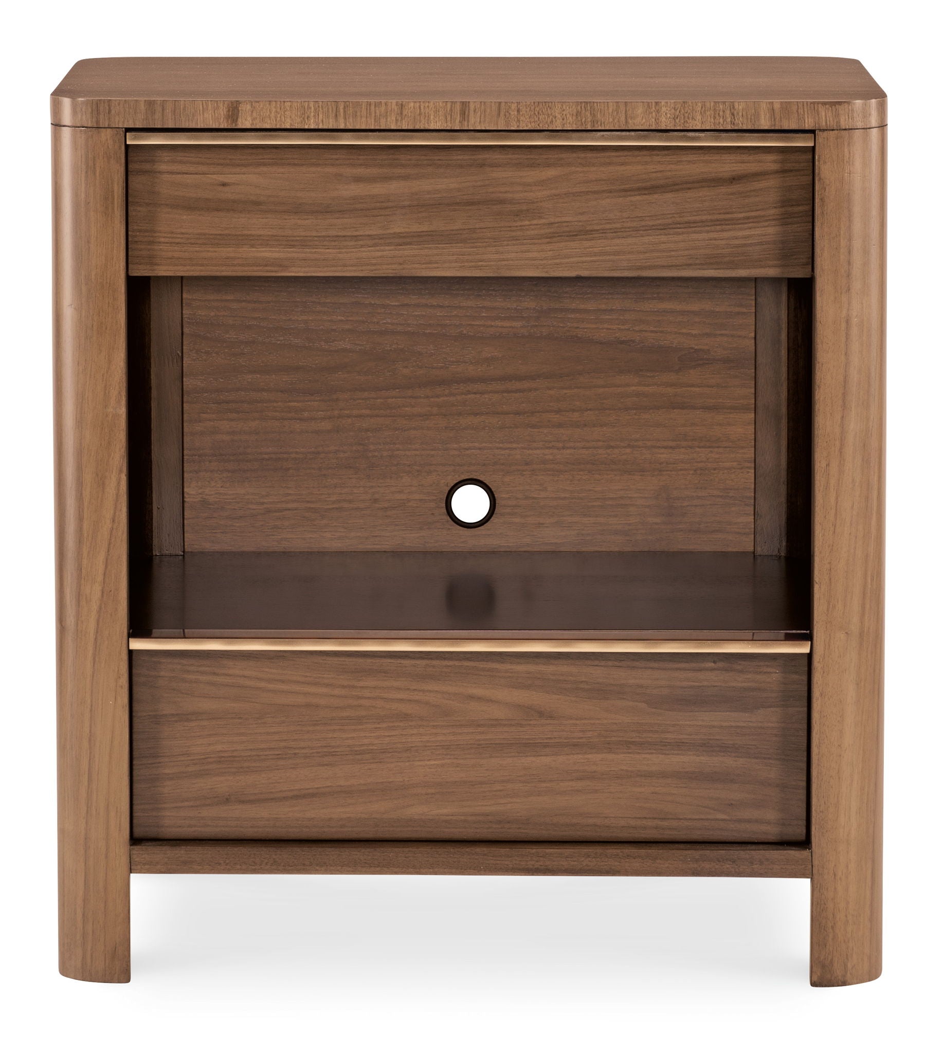 The Eleana Two Drawer Nightstand offers refined storage with its Light Caramel walnut veneer finish and Sunlit Bronze hardware. With two self-closing drawers, an integrated charging station, and discreet wire management, this nightstand balances style and modern functionality.