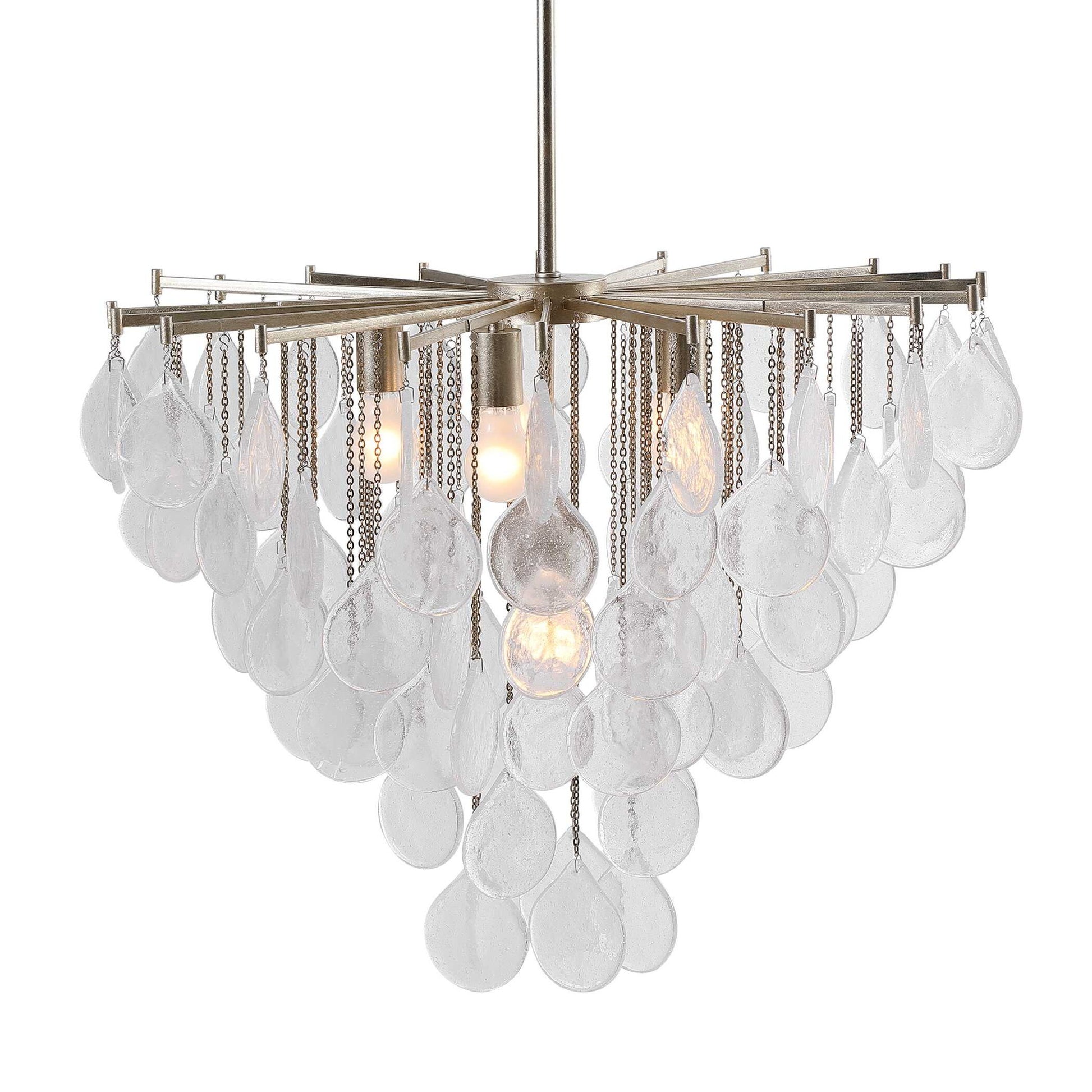 A Classic Shape With Sumptuous Tear Drop Seeded Glass Suspended On Fine Chains Refracting Light Beautifully. Transcending Traditional Design To Blend In With Even More Contemporary Interiors And Finished In A Rich Antique Bright Silver Leaf. 6-60 Watt Max, Edison Sockets. Bulbs Not Included. Supplied With 15' Wire, 3-12" Stems And 1-6" Stem For Adjustable Installation.