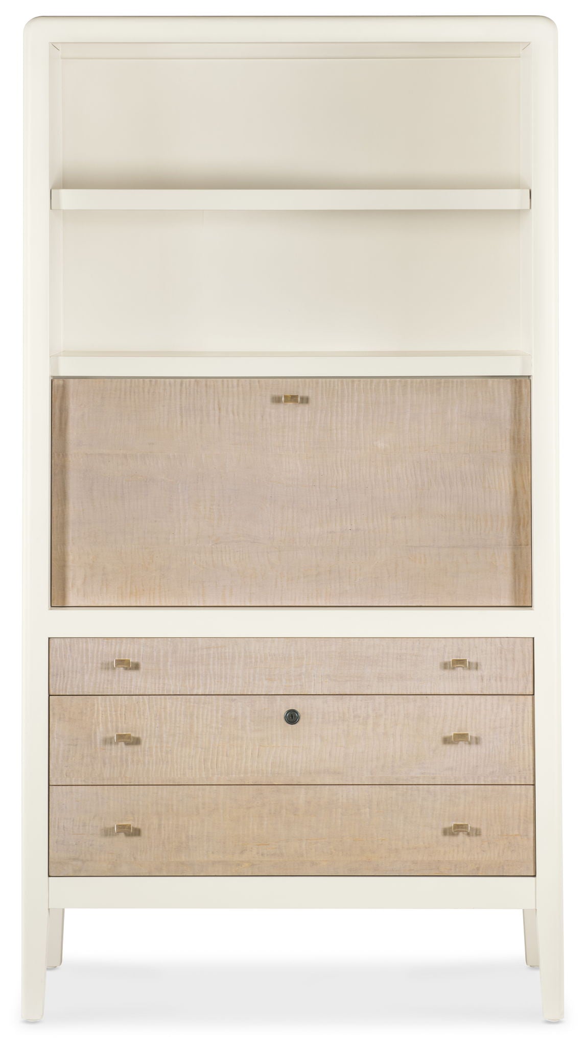 Contrasting a serene Almond White finish with Maple and Figured Maple Veneers on the drop-down front and drawer fronts, the Hera Hub gets you organized and keeps clutter out of sight. Perfect for the kitchen, bedroom, loft or living space, it has one adjustable wood shelf in the top section and one fixed wood shelf in the top section. The drop-front writing surface opens to reveal 6 small drawers and one adjustable wood shelf. There’s a cutout in the back panel for wire management and two bottom drawers underneath the drop-front area. The top drawer has a cream-colored removable felt-lined tray, and the bottom drawer has a lock and two compartments. The right compartment has hanging file storage. The left compartment has a removable tray.
