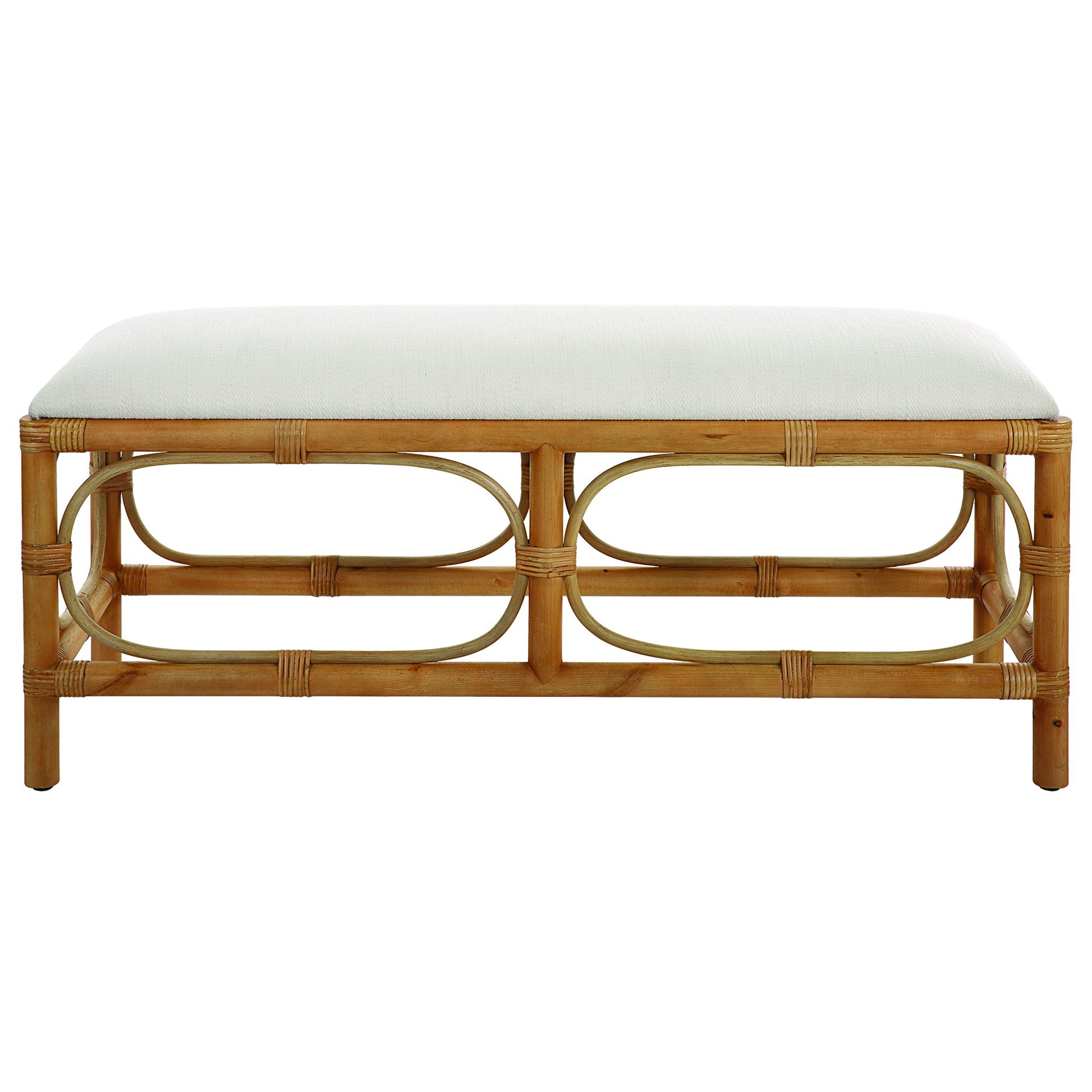 A Refreshing Coastal Accent Featuring A Crisp White Textured Fabric, Over A Naturally Finished Solid Wood Base With Rattan Wrapped Accents. Perfect At The Foot Of A Bed Or As Additional Family Room Seating.