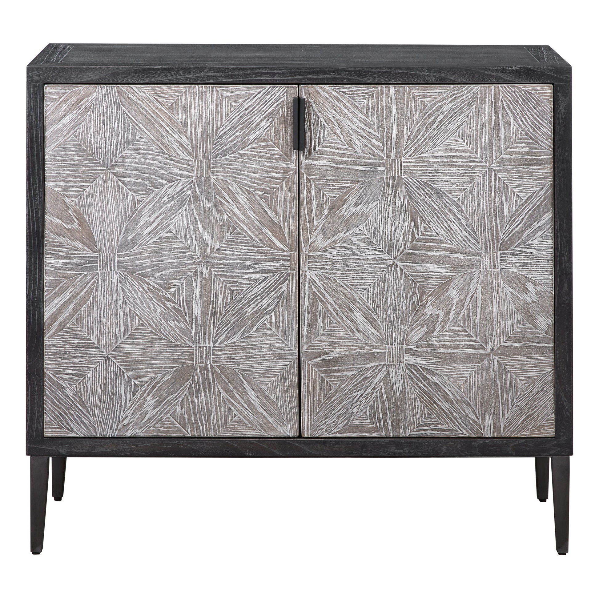 Showcasing A Modern Lodge Style, This Two Door Cabinet Features Hand Pieced Mosaic Doors In Oak Veneer Finished In Light Gray, With A Contrasting Elm Veneer Case Finished In Deep Black With Light Gray Glazing. Accented With Solid Iron Hardware And Legs In Aged Black. Has One Fixed Interior Shelf.