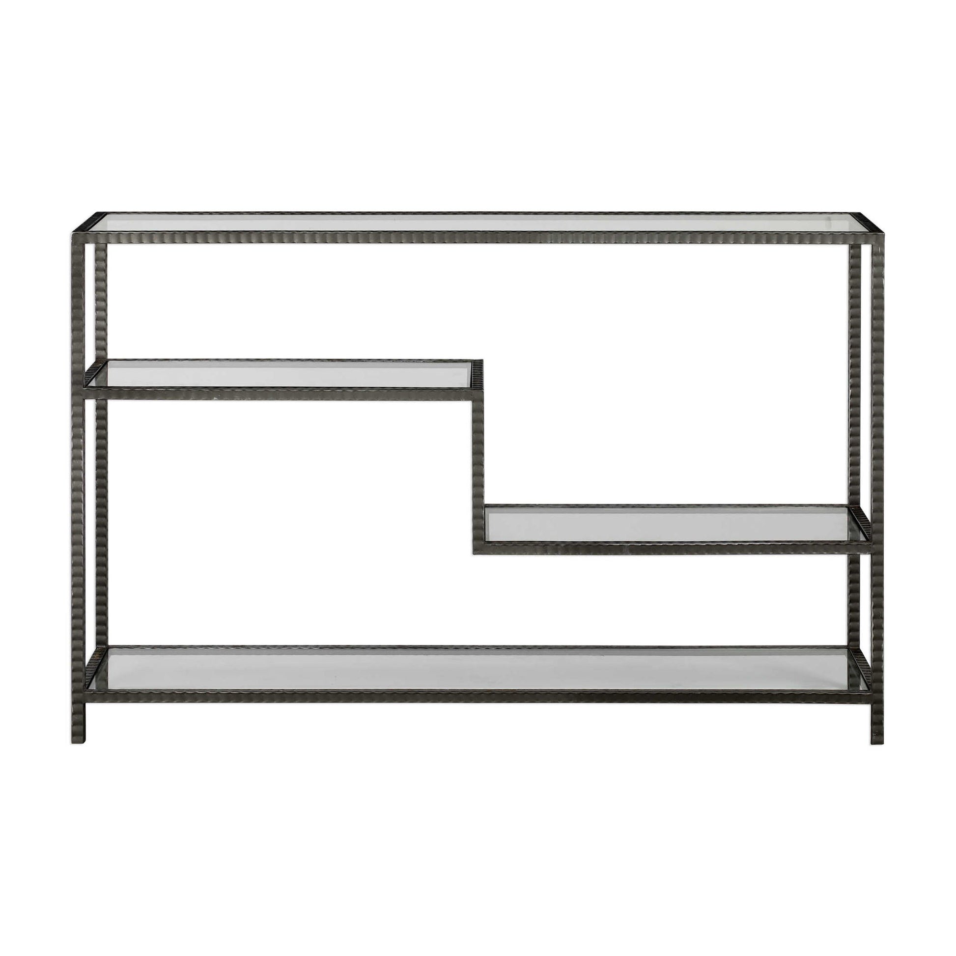 Industrial Inspired Function With Multi-level Display Shelves, Featuring Ribbed Iron Finished In An Aged Gunmetal With A Light Rust Patina. Shelves Are Clear Tempered Glass.