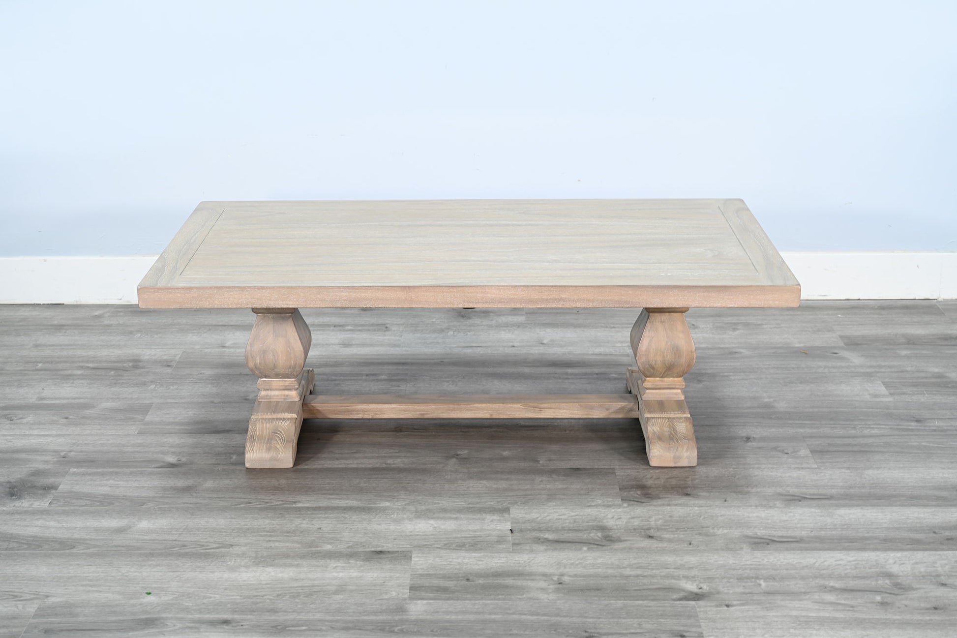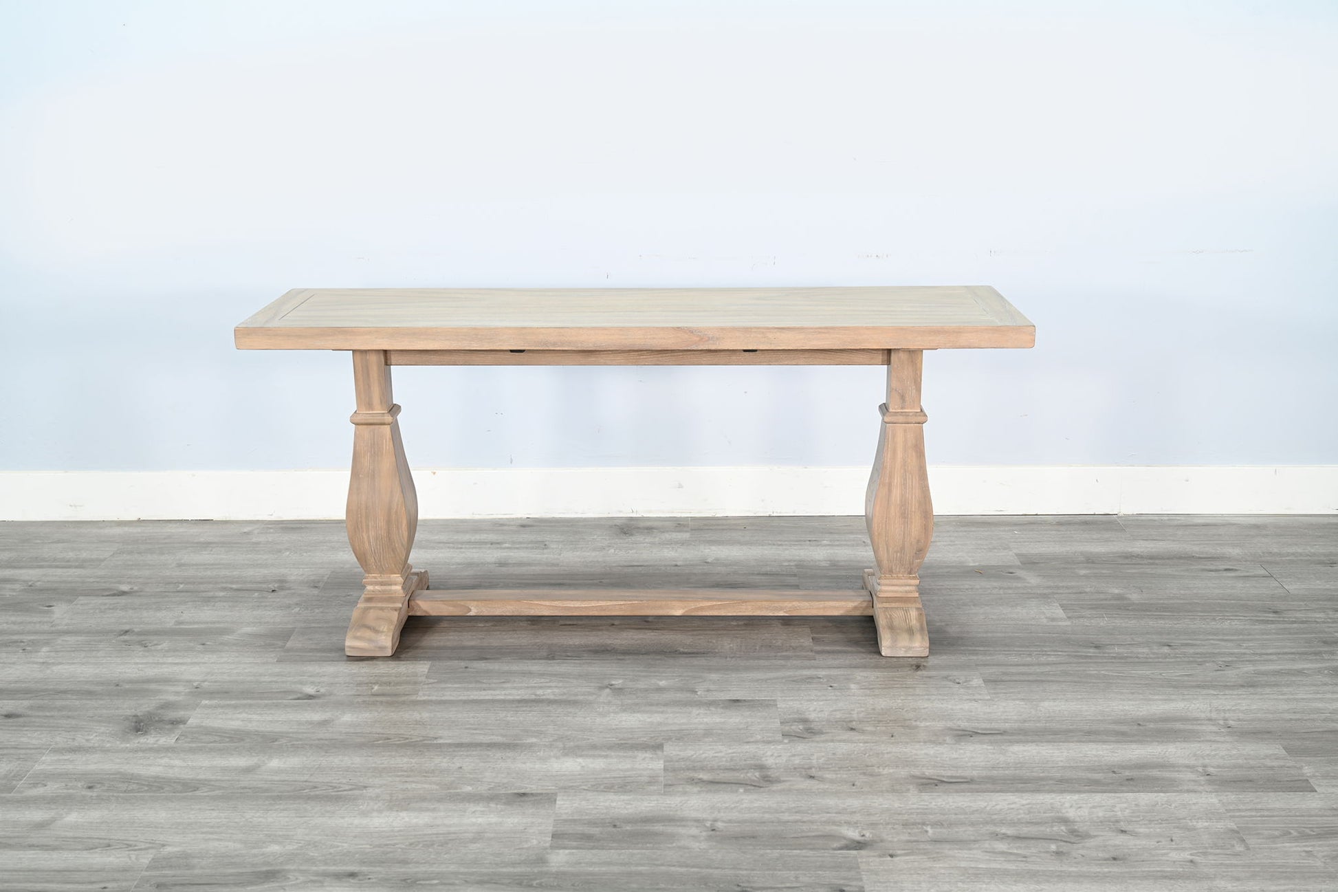 This beautifully crafted table features a timeless trestle base and a spacious rectangular top, offering both elegance and functionality to your living space. Made from solid wood with a weathered finish, it adds a rustic charm while ensuring durability. Perfect for showcasing decor or serving as a gathering spot for family and friends, this table is a versatile centerpiece for any home.