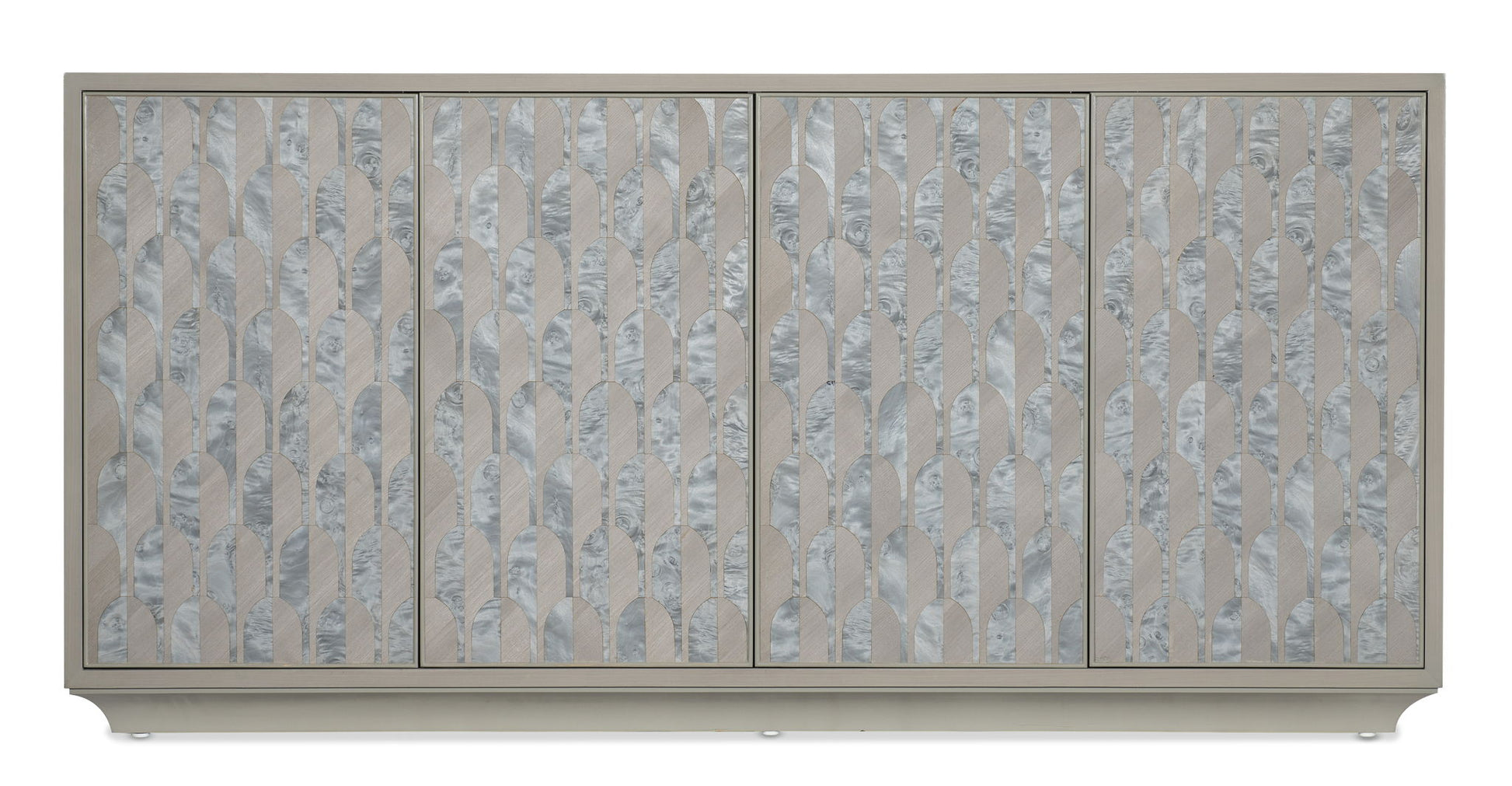 Quartered Hickory and Burl Veneers get a modern twist with the Emile Credenza. The door fronts feature a burl and wood cutout motif with dyed charcoal-colored Quartered Hickory Veneer and dyed charcoal Burl Veneers, accented with silver and gray Burl cutouts on the drawer fronts. The four doors have touch latches and two adjustable shelves behind each pair of doors, along with wire management grommets. Credenza measures 78 W x 20 inches deep.