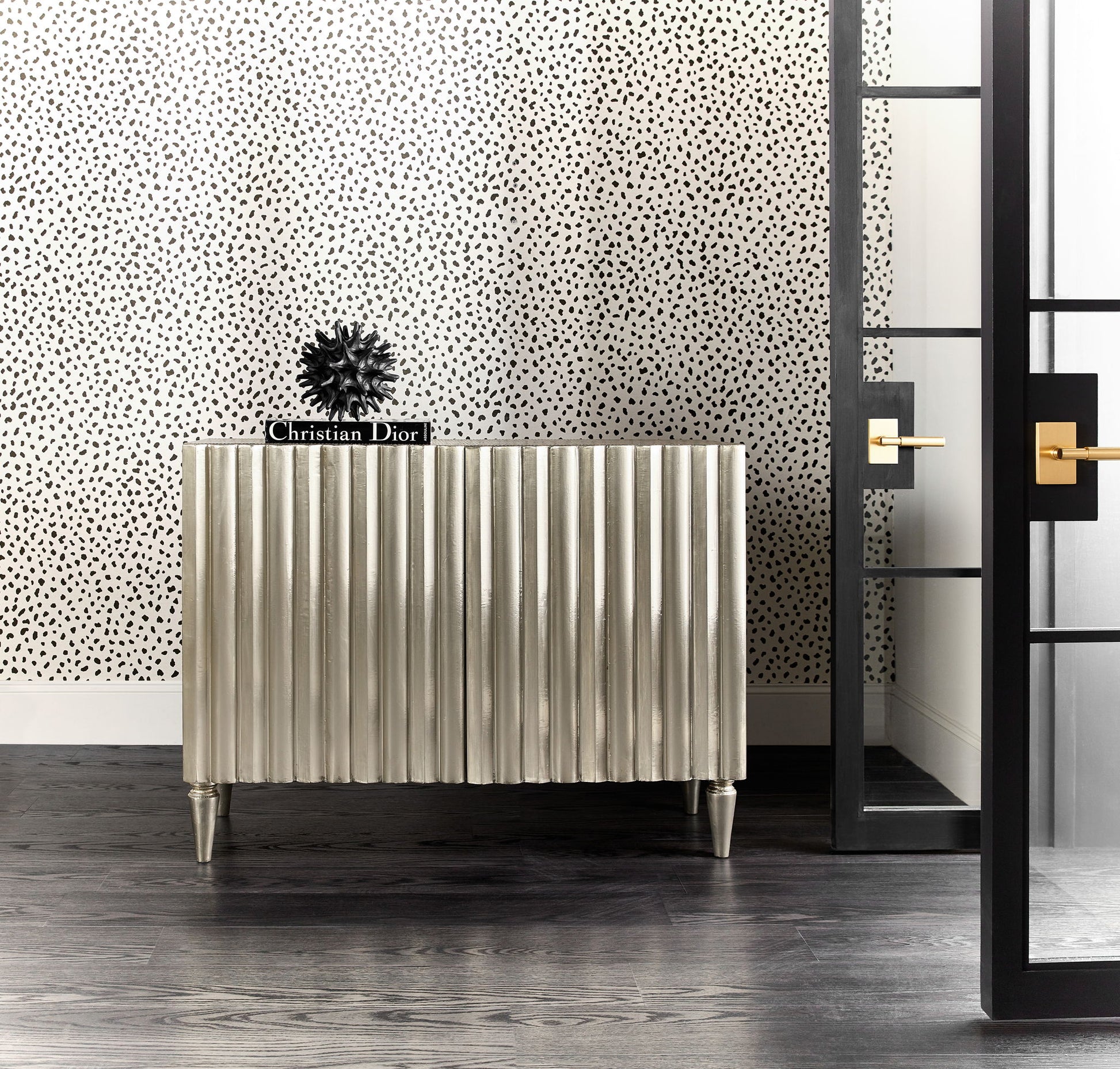 Channeling the ambience of a Paris townhouse, the Mackenna Two-Door Chest is crafted of Mango Wood and covered in German Silver Foil in a dimensional, textured case with two doors, one removable shelf behind each door and a ventilated back panel.