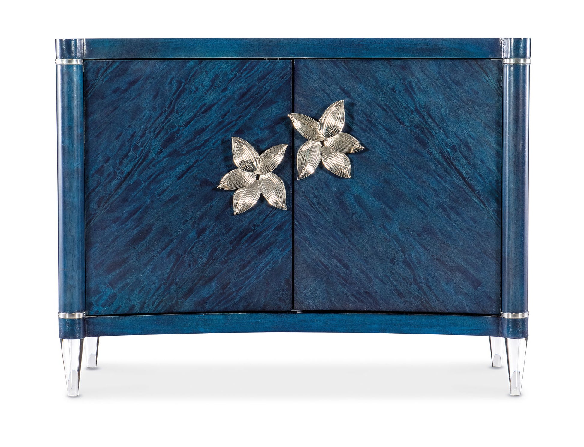 The glamour is in the details of the Mélange Sapphire Chest: the rich sapphire-blue finish over figured Primavera Veneers, the broach-like dramatic silver floral hardware, silver metal accents and acrylic legs. It all adds up to an uptown accent to create a burst of style for any space. The two doors have soft-close hinges and magnetic door catches with one adjustable shelf inside and one soft-closing drawer inside. The drawers have a painted blue interior.