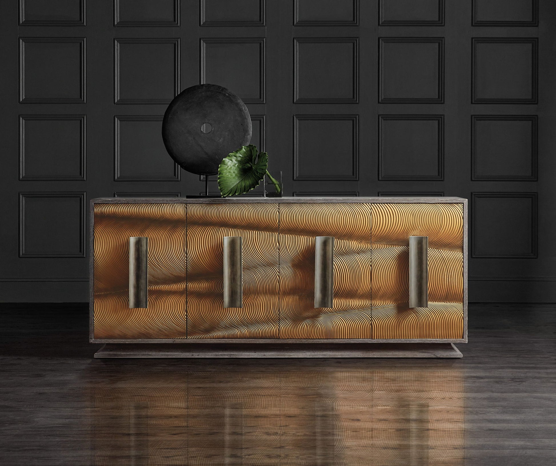 With an earthy and exotic elegance, the Mélange Swaley Four-Door Credenza is a striking silhouette with a dramatic gold swirl motif on the front, accented by dramatic curved vertical rectangle-shaped bronze hardware. Crafted of Oak Veneers and Resin, the credenza has 2 adjustable shelves behind each pair of doors, a ventilated back panel with wire management and a power supply