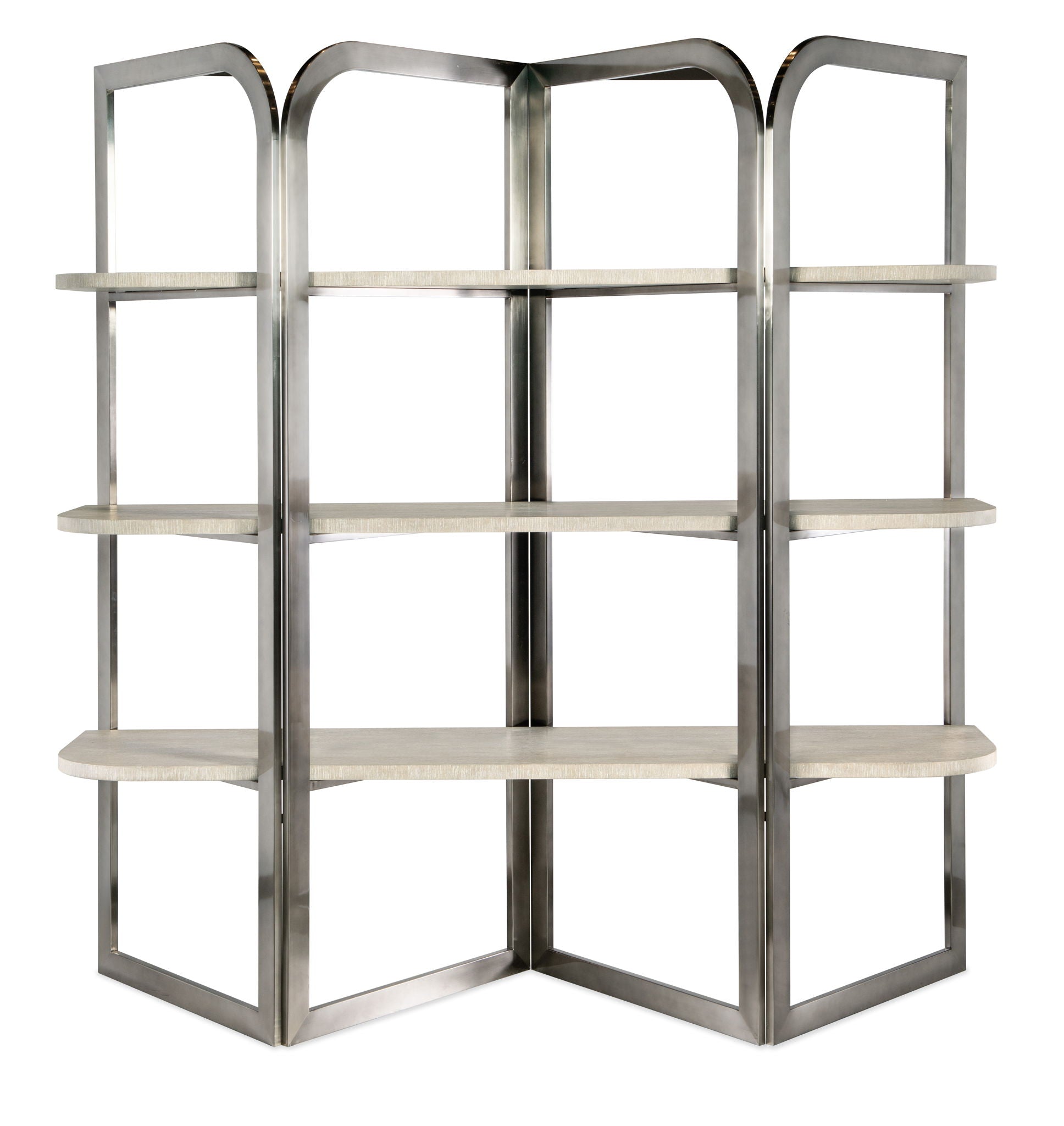 Architectural and artistic with a luxe mixture of materials, the Modern Mood Etagere has three fixed shelves crafted of wire-brushed Quartered Oak in the Mink finish with dark, earthy brown hues with notes of black. The shelves are surrounded by a shaped brushed metal frame in a warm pewter-colored finish. Finished all the way around, the shelf can be used from either side and can float in a room.