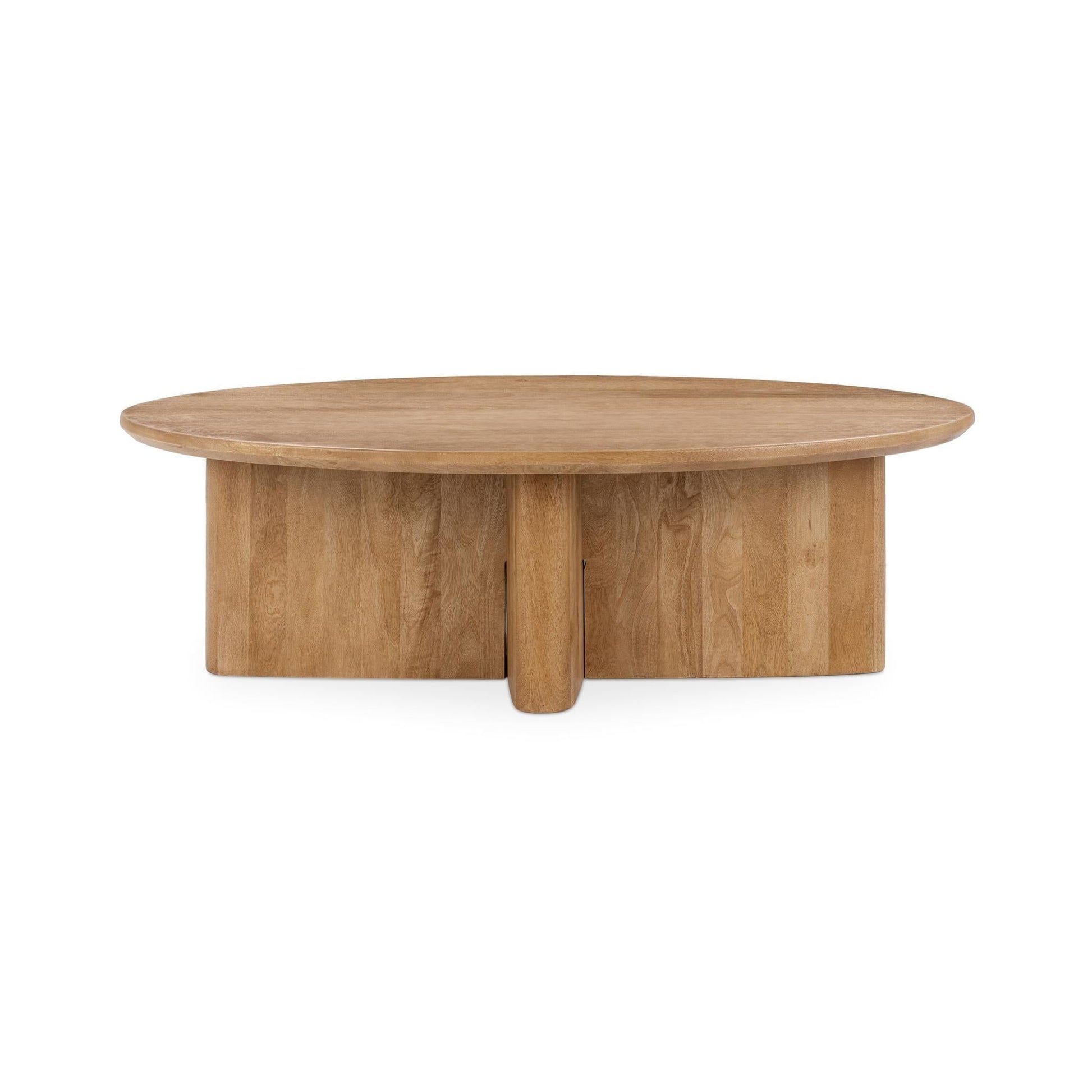 Organic form meets sculptural beauty in this mango wood coffee table. Featuring a gracefully oval tabletop and bold, architectural base, each piece is handcrafted from solid mango wood, revealing the unique grain and warm tone of this sustainable material. A striking centerpiece for living rooms, this modern wood coffee table invites conversation and elevates any space. Perfect for styling with books, art, or your favorite coffee moments.