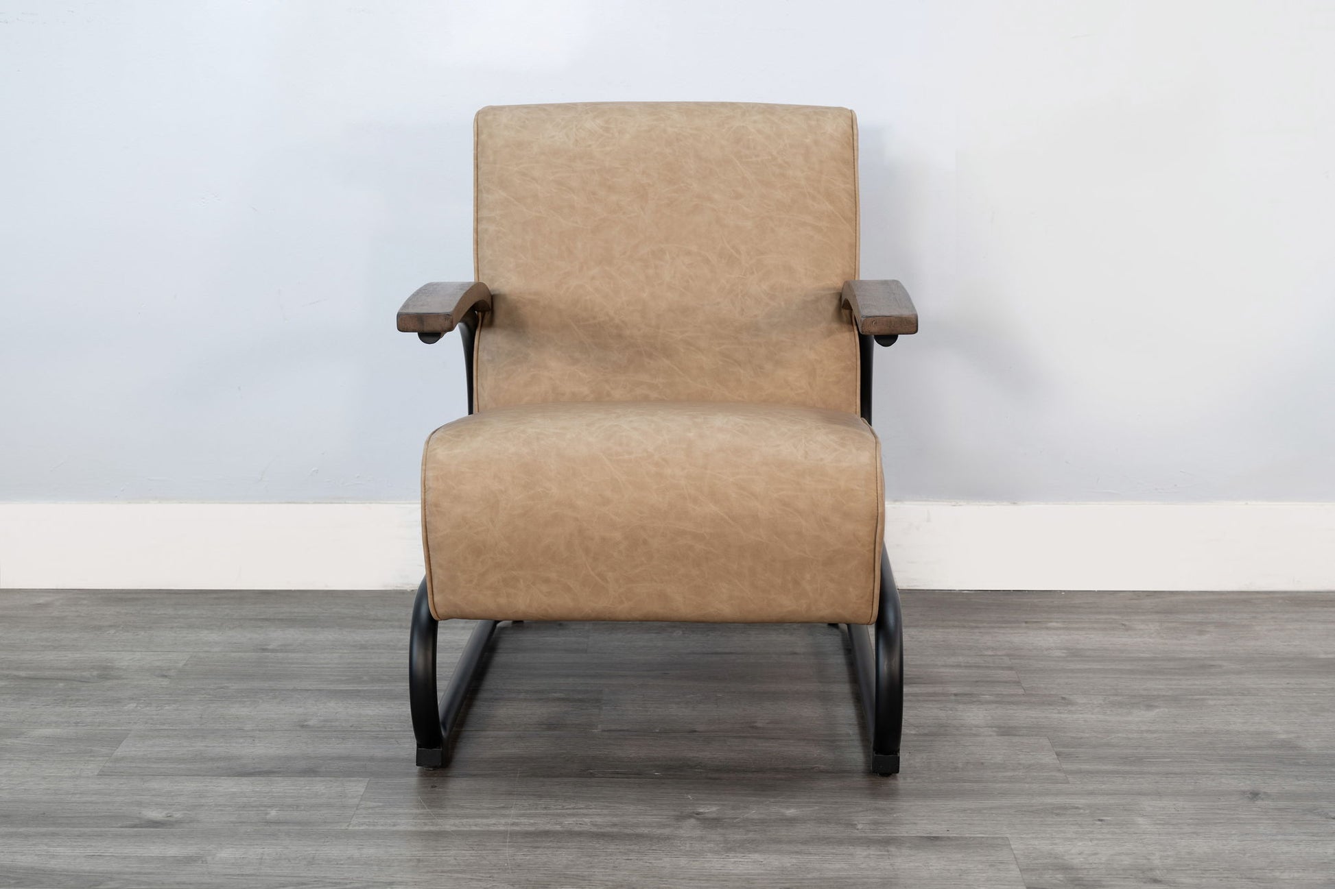 Blending modern comfort with industrial style, this accent chair features a sleek metal frame with smooth, flowing curves and solid wood armrests. The generously padded seat and back are upholstered for a soft, inviting feel, making it perfect for relaxing in a living room, office, or reading nook. Its distinctive design adds a stylish statement while offering long-lasting comfort and durability.