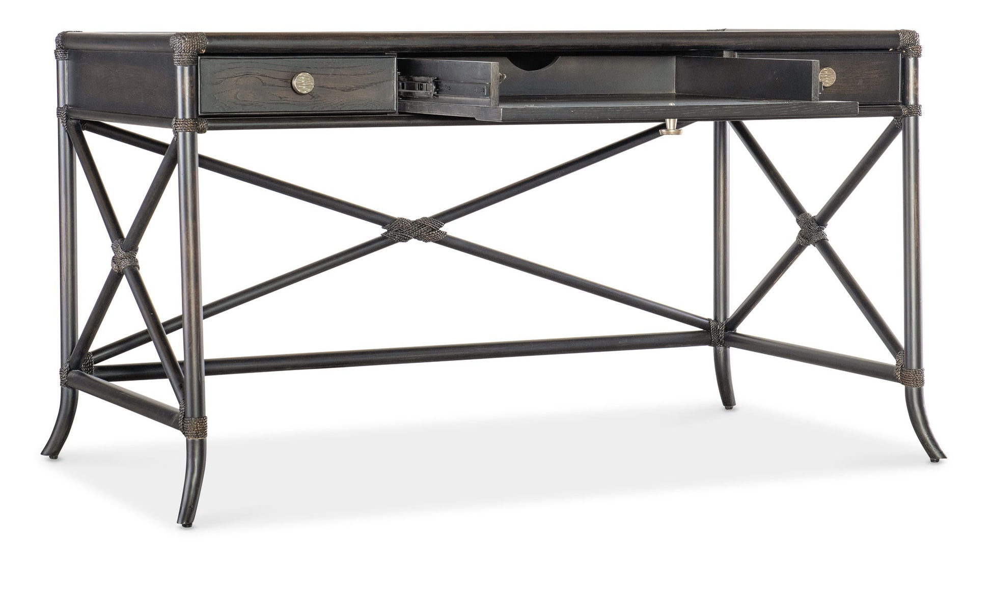 With the sublime vibe of an island oasis, the Retreat Writing Desk is crafted of Oak and Maple Veneers in a Bamboo motif and accented by rope. X-design stretchers on the back and sides distinguish the piece, along with the sand-colored finish, transparent by design to showcase the unique patterns of the wood veneer. Featuring three drawers, the left and right drawers have two removable dividers. One pencil tray and one writing slide may be used on either side, and the center drawer has a drop-front for keyboard use. Finished on all sides.