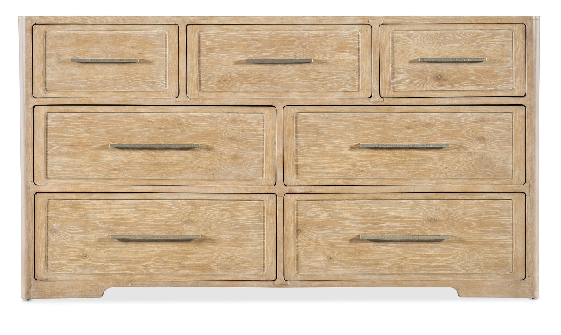 The Retreat Dresser has a tranquil personality with a modern twist and organic, textured pewter bar pulls. Crafted of Oak and Maple Veneers, it is finished in the sand-colored Dune, transparent by design to showcase the unique grain patterns of the veneer. The top three drawers have removable felt liners and the top center drawer has a removable jewelry tray. The bottom two drawers have cedar-lined bottoms.