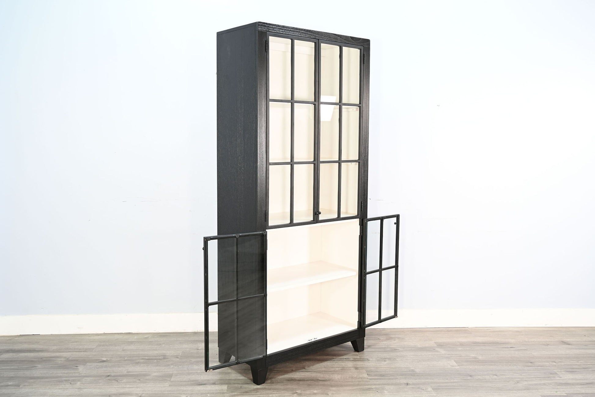 The clean lines and black finish make it a versatile piece that can complement various interior styles, from modern to traditional. The glass doors allow for easy viewing and access to the contents, while the simple latch mechanism keeps your items secure. The divided glass panes add a touch of elegance, making this cabinet not only functional but also a beautiful focal point in any room. Perfect for living rooms, dining rooms, or hallways.