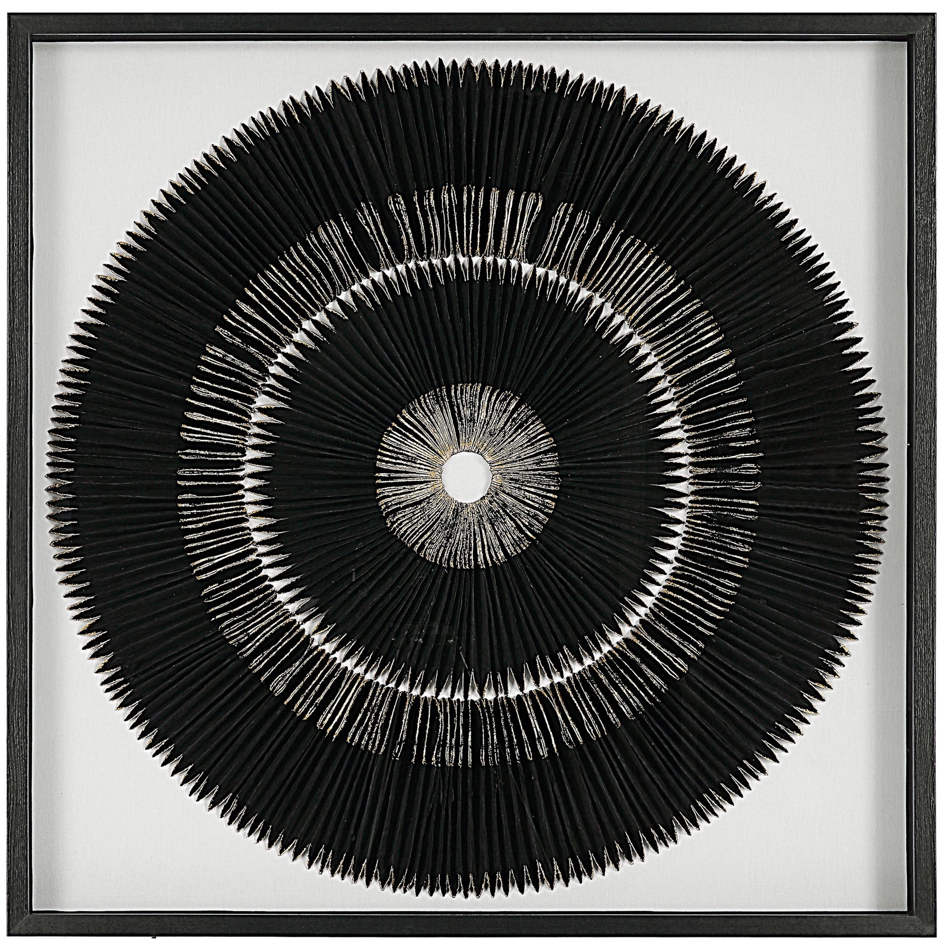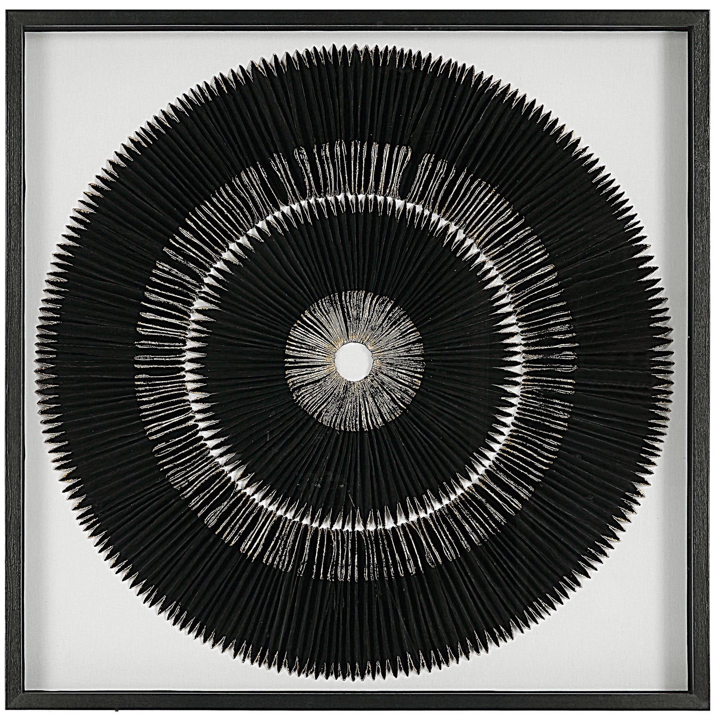 Handcrafted By Skilled Artisans, This Wall Decor Features A Striking Black And Gold Leaf Medallion. Artwork Is Set Against A White Linen Backing In A Black Shadowbox Style Pine Wood Frame Under Glass.