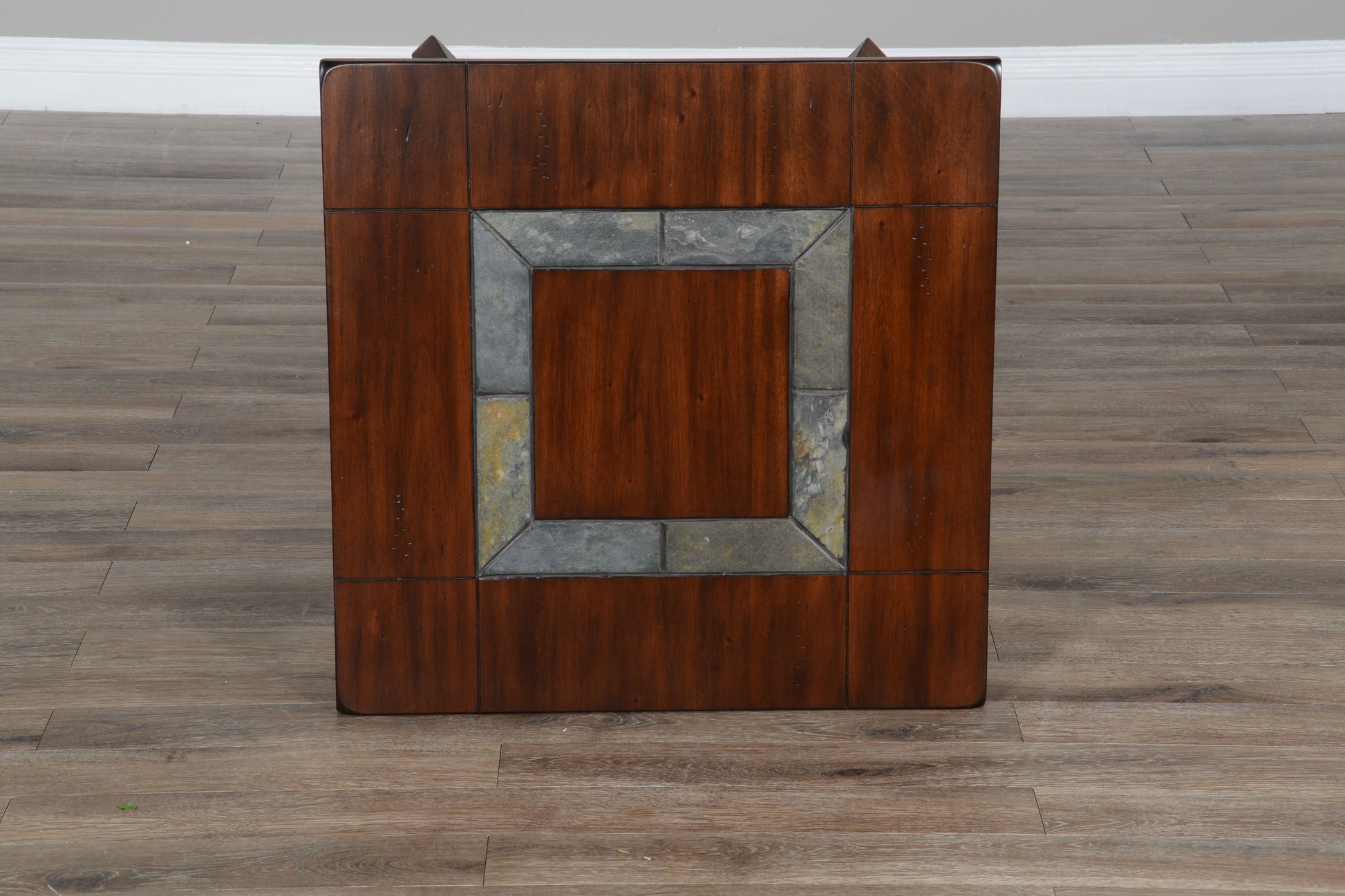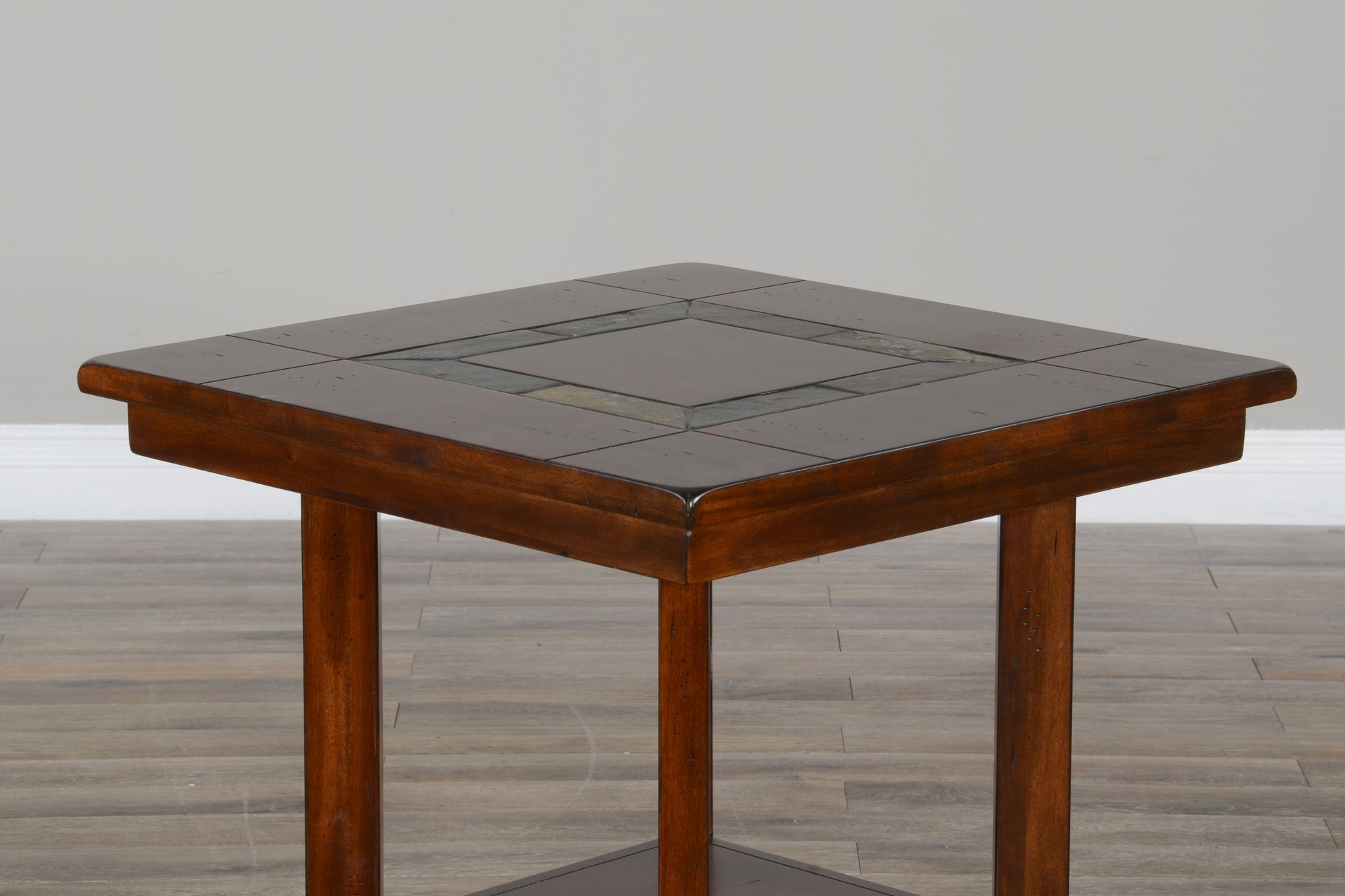 This Santa Fe End Table with slate inlay is a traditional design that was crafted with distressed mahogany solids and veneers. The table has one storage shelf and the tabletop has beautiful slate inlays.