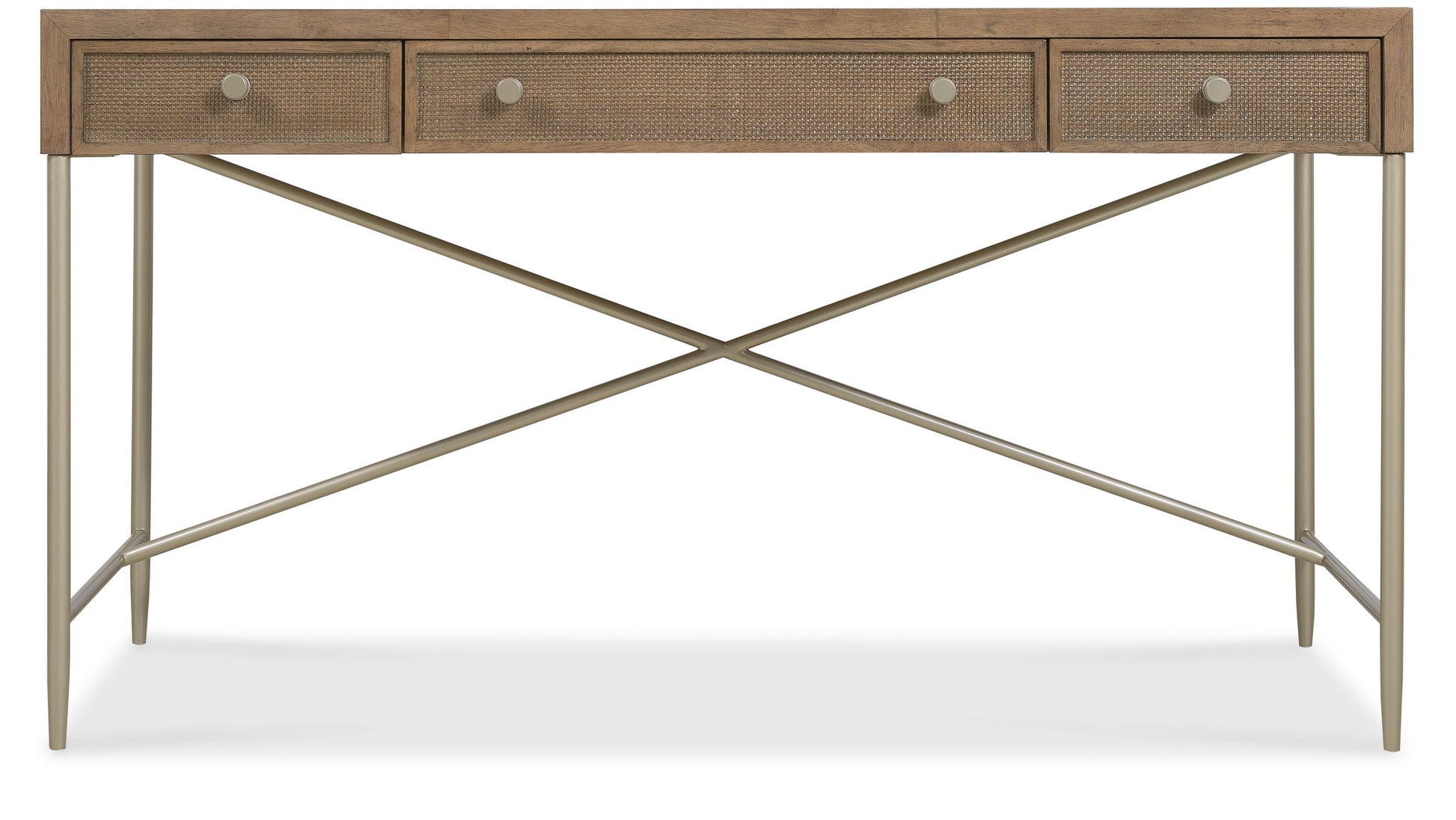 An ideal writing desk for any space – loft, bedroom, kitchen, living area – the Sonnet Writing Desk offers a stylistically versatile, functional piece blending natural textures with a refined minimalist silhouette. Crafted of Quartered and Cathedral-Cut White Oak Veneers in a light earthen finish with complementary woven cane drawer fronts and outer surface, it has a metal base, stretcher and tapered, slender legs. Featuring three drawers, it has a writing insert and pencil tray that can be used in either the left or right top drawer. Each of the top drawers has two removable partitions. The center drawer has a drop-front writing surface and wire management. Measures 58 inches wide by 28 inches deep.