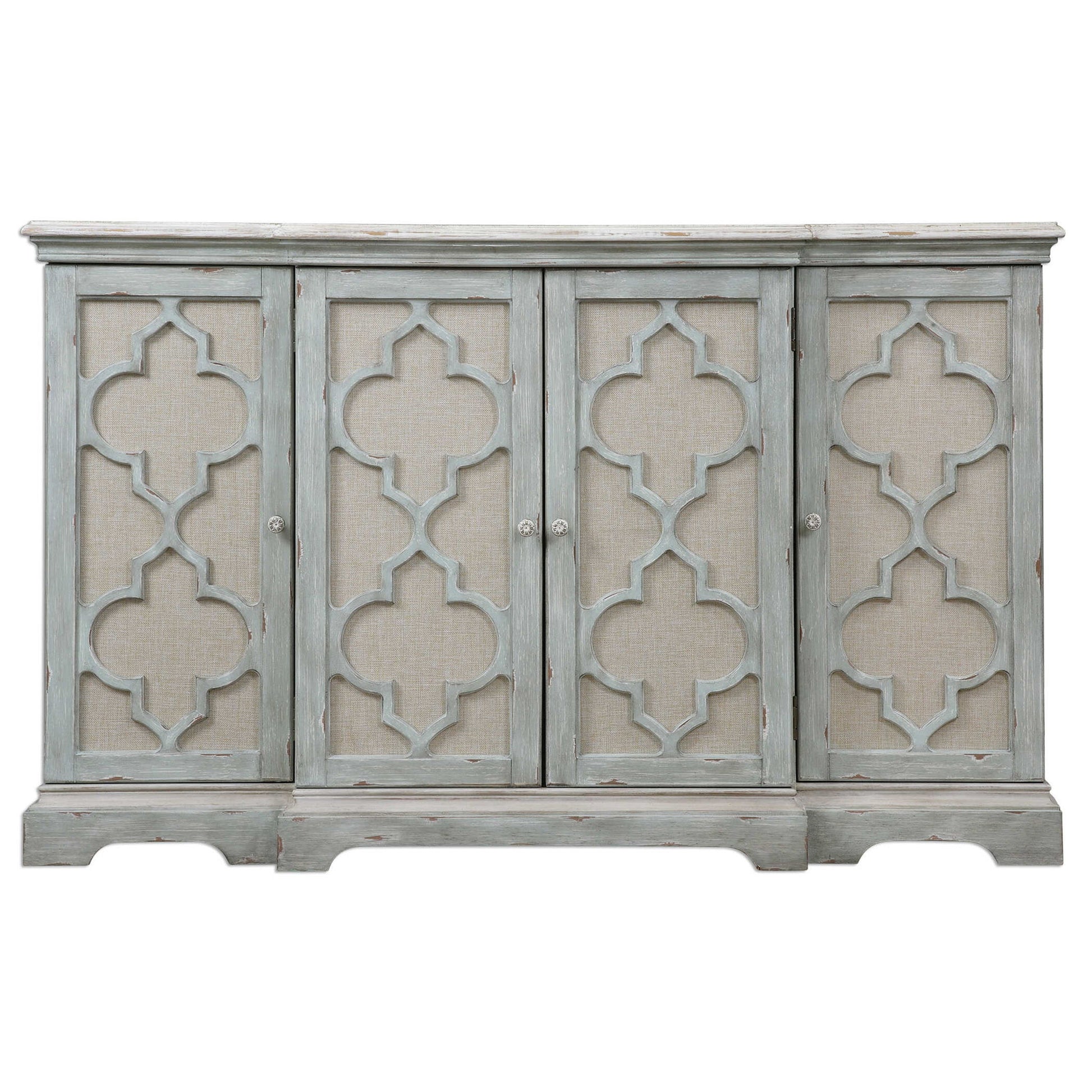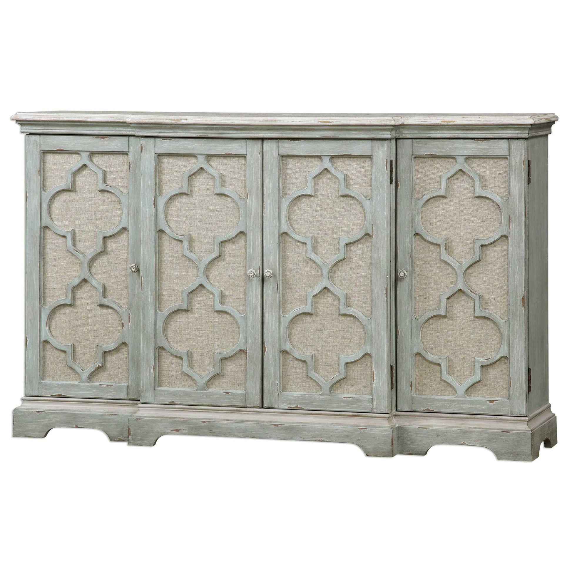 Breakfront Console In Weathered Sea Gray With Ivory Accents. Open-carved Doors Are Backed In Light Tan Linen, Enclosing Three Adjustable Shelves.