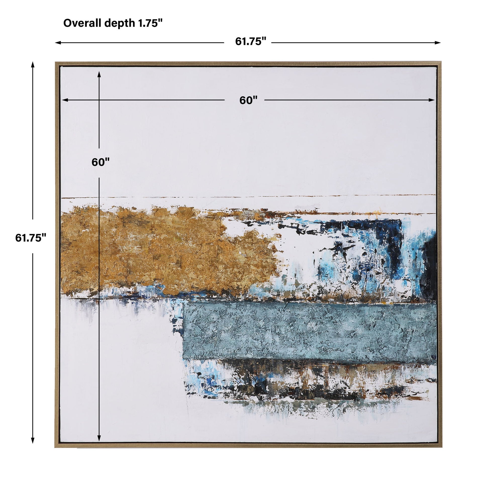 Mimicking The Stacking Of Bricks, This Hand Painted Abstract Is Bold In Both Color And Texture. Shades Of Blues, Charcoal, And Gold Pop Against The White Background And Is Surrounded By A Gold Gallery Frame. Due To The Handcrafted Nature Of This Artwork, Each Piece May Have Subtle Differences. This Piece May Be Hung Horizontal Or Vertical.