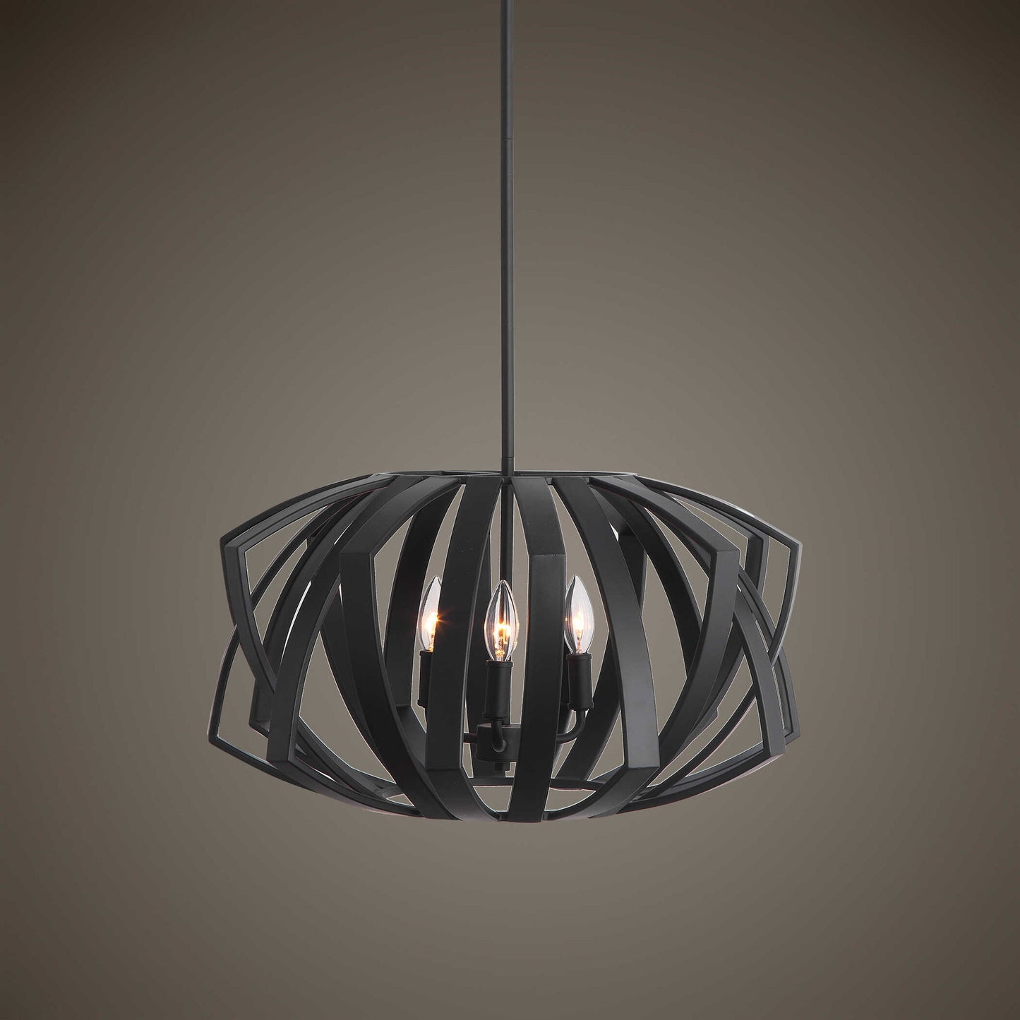 Matte Black Geometric Pendant Harkens From Mid-century Design Roots. 3-60 Watt Max, Candelabra Sockets. Bulbs Not Included. Supplied With 15' Wire, 3-12" Stems And 1-6" Stem For Adjustable Installation.